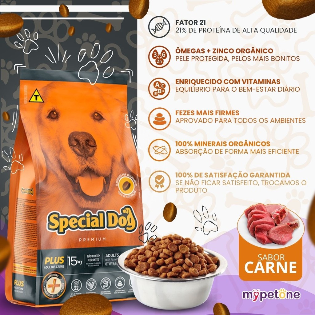 | Ração Special Dog Plus Adultos Carne - 15Kg este produto | R$ 109,90 | 31% | 4.9/5 | 37 |