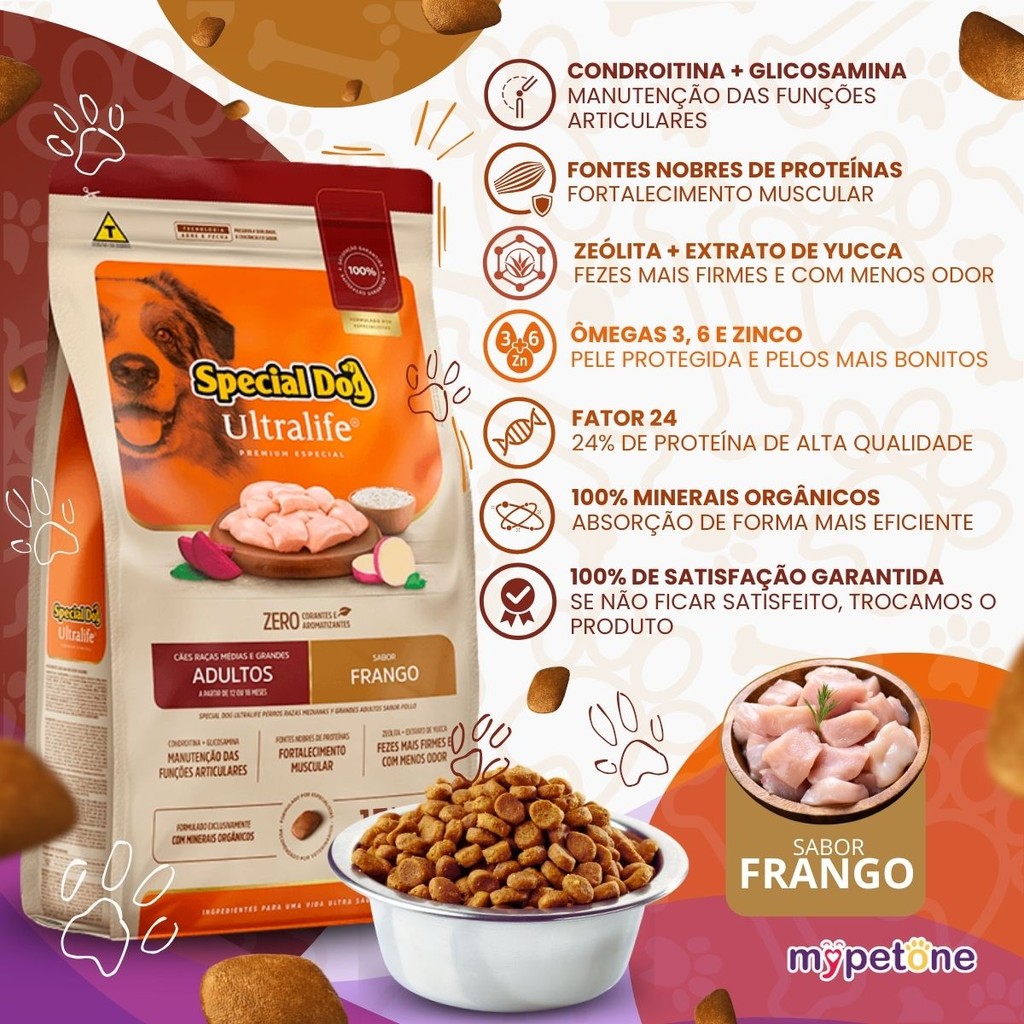 Special Dog Ultralife Adultos Raças Médias e Grandes Sabor Frango - 15,1Kg - Zero corantes e aromatizantes - Enriquecido com Condroitina e Glicosamina para proteção articular - Fontes nobres de proteína que contribuem para o fortalecimento muscular - Zeólita + Extrato de Yucca: reduz a umidade das fezes, deixando-as mais firmes e com menos odor - Este produto possui 100% Satisfação Garantida. Solicitações devem ser encaminhadas diretamente para o fabricante. Informações Special Dog Ultralife Frango para Cães Adultos de Raças Médias e Grandes é formulada com ingredientes selecionados como batata-doce, beterraba e arroz. Possui Condroitina e Glicosamina, que auxiliam na proteção articular e fontes nobres de proteínas, contribuindo para o fortalecimento muscular. Composição Básica Farinha de vísceras de aves, farinha de carne e ossos de bovinos, farinha de batata-doce, arroz quebrado, milho moído*, proteína concentrada de soja*, farelo de soja*, óleo de aves, biomassa de microalgas desidratada (Schizochytrium sp.), polpa de beterraba, farelo de trigo, levedura de cana-de-açúcar inativada e desidratada, extrato de Yucca schidigera (0,04%), zeólita (0,25%), mananoligossacarídeos (0,048%), sulfato de glicosamina (0,05%), sulfato de condroitina (0,03%), hidrolisado de carne de aves e fígado de aves, regulador de acidez, antioxidantes (BHA e BHT), DL-metionina, triptofano, cloreto de sódio, cloreto de potássio, vitamina A, vitamina D3, vitamina E, vitamina K3, vitamina B1, vitamina B2, vitamina B6, vitamina B12, vitamina C, niacina, cloreto de colina, ácido pantotênico, ácido fólico, biotina, iodato de cálcio, levedura enriquecida com selênio, proteinato de cobre, proteinato de ferro, proteinato de manganês, proteinato de zinco, propionato de cálcio, parede celular de levedura. *Agrobacterium tumefaciens, Bacillus thuringiensis, Streptomyces viridochromogenes. Enriquecimento por Kg do Produto Vitamina A 24.000 UI, vitamina D3 900 UI, vitamina E 135 UI, vitamina K3 3 mg, vitamina B1 10,5 mg, vitamina B2 6,6 mg, vitamina B6 3 mg, vitamina B12 90 μg, vitamina C 33 mg, niacina 45 mg, colina 1.200 mg, ácido pantotênico 21 mg, ácido fólico 0,6 mg, biotina 0,06 mg, cobre 6 mg, ferro 40 mg, iodo 1,5 mg, manganês 20 mg, selênio 0,3 mg, zinco 90 mg. Níveis de Garantia Umidade máx. 100 g/kg 10% Proteína Bruta mín. 240 g/kg 24% Extrato Etéreo mín. 120 g/kg 12% Matéria Mineral máx. 80 g/kg 8% Matéria Fibrosa máx. 30 g/kg 3% Cálcio máx. 20 g/kg 2% Cálcio mín. 8.000 mg/kg 0,8% Fósforo mín. 8.000 mg/kg 0,8% Sódio mín. 1.200 mg/kg 0,12% Potássio mín. 5.000 mg/kg 0,5% DL-metionina mín. 4.000 mg/kg 0,4% Ômega 6 mín. 20 g/kg 2% Ômega 3 mín. 2.600 mg/kg 0,26% Energia Metabolizável 3.861 kcal/kg Indicação: Cães Adultos Porte: Raças Médias e Grandes Sabor: Frango com Batata-doce, Beterraba e Arroz Trânsgênico: Sim