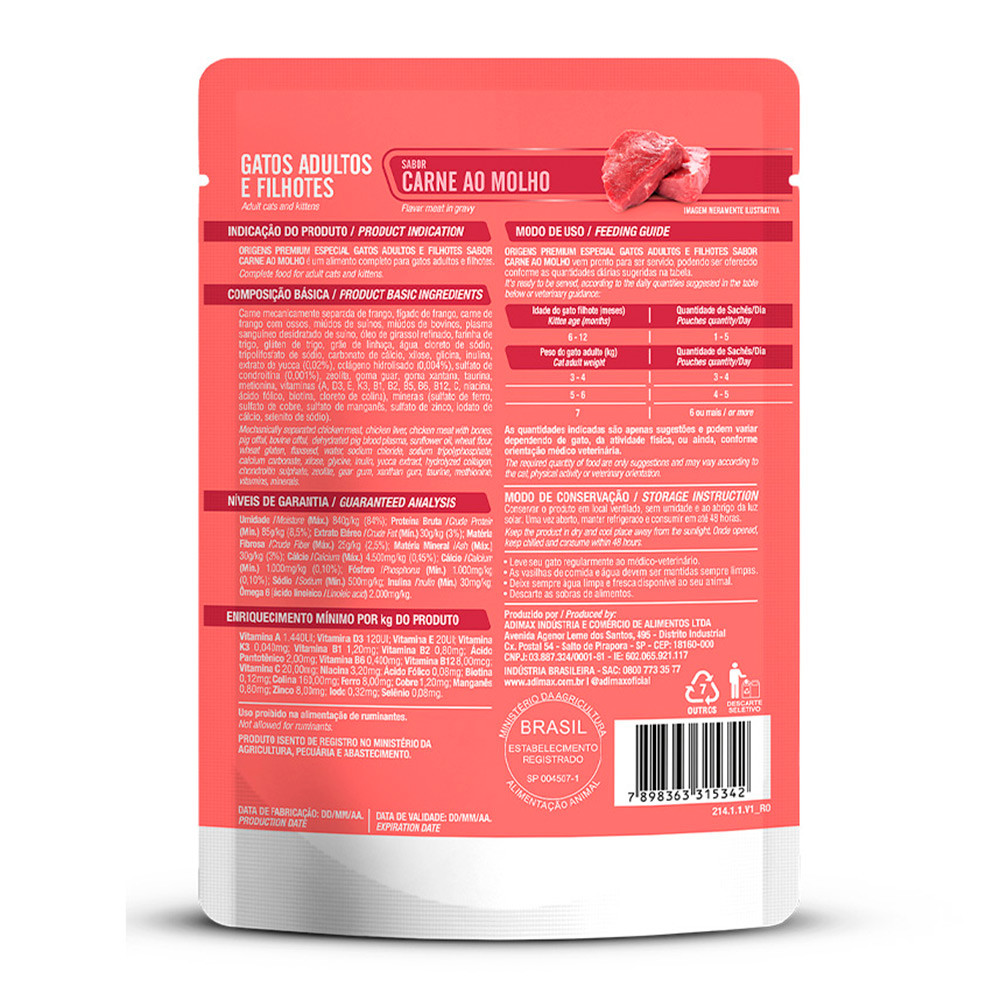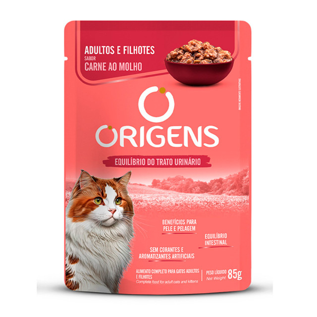 Ração Úmida Origens Sachê Gatos Adultos e Filhotes Sabor Carne ao Molho 85g
