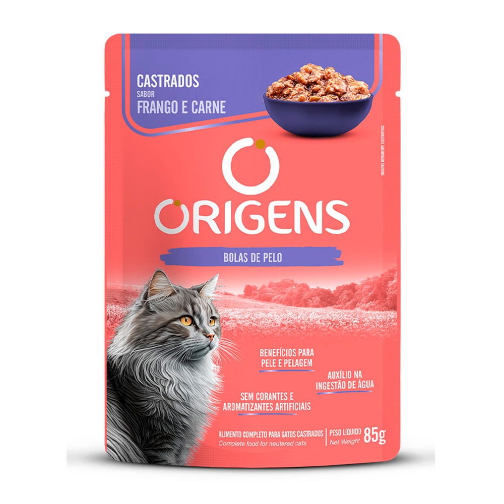 Ração Úmida Origens Sachê Gatos Castrados Sabor Frango e Carne 85g
