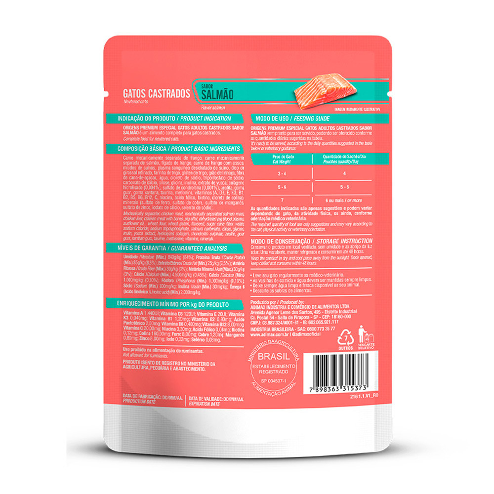 - Indicado para gatos; - Para gatos adultos castrados; - Auxilia no trato urinário; - Rico em proteínas, vitaminas e minerais; - Alimento úmido nutritivo e saboroso; - Livre de corantes e aromatizantes artificiais. A Ração Úmida Origens Gatos Castrados Salmão é opção excelente de alimento para deixar a rotina alimentar do seu gatinho ainda mais saborosa e nutritiva. Origens Sachê Gatos Castrados possui ótima quantidade de nutrientes e alta palatabilidade. Uma combinação de salmão que é rica em proteínas, vitaminas e minerais. Auxilia equilíbrio do trato urinário, auxiliam na manutenção da pele e da pelagem saudáveis e possuem níveis moderados de calorias. Recomendação diária Gato Castrados De 3kg a 4kg: 4 sachês De 5kg a 6kg: 5 a 6 sachês De 7kg: 6 sachês ou mais. Ingredientes Carne mecanicamente separada de frango, carne mecanicamente separada de salmão, fígado de frango, carne de frango com ossos, miúdos de suínos, plasma sanguíneo desidratado de suíno, óleo de girassol refinado, farinha de trigo, glúten de trigo, grão de linhaça, fibra de cana-de-açúcar, água, cloreto de sódio, tripolifosfato de sódio, carbonato de cálcio, xilose, glicina, inulina, extrato de yucca, colágeno hidrolisado (0,004%), sulfato de condroitina (0,001%), zeolita, goma guar, goma xantana, taurina, metionina, vitaminas (A, D3, E, K3, B1, B2, B5, B6, B12, C, niacina, ácido fólico, biotina, cloreto de colina), minerais (sulfato de ferro, sulfato de cobre, sulfato de manganês, sulfato de zinco, iodato de cálcio, selenito de sódio).