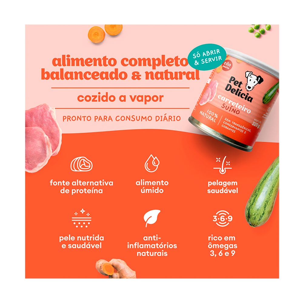 Ração Úmida Para Cães Adultos Pet Delícia Sabor Carreteiro Suíno 320g - Indicado para cães adultos;- Cortes nobres de carne suína e legumes frescos;- Rico em fibras, prebióticos e beta-glucanos;- Rica em ômegas 3, 6 e 9; - Auxilia na pele saudável e pelos com brilho;- Baixo teor de carboidratos. Ração Úmida Pet Carreteiro Suíno é um alimento saboroso para o seu cãozinho. Uma receita muito bem desenvolvida com uma perfeita de cortes nobres de carne suína e legumes frescos adicionando de forma natural, carboidratos, água, minerais, proteínas, vitaminas e principalmente fibras na porção necessária contribuindo com a digestão. Pet Delícia Carreteiro Suíno para Cachorro é uma proteína alternativa e recomendada para trazer mais variedade no cardápio do seu cãozinho, além de oferecer uma opção nova para cães com restrição a outras proteínas ou ingredientes. Com ômegas 3 e 6 para promover uma pele saudável e pelos brilhantes. Com antioxidantes e anti-inflamatórios naturais, fibras, prebióticos e beta-glucanos. Modo de usar Quantidade diária recomendada. Para Cães de 1kg a 6kg: 85g a 320g por dia.Para Cães de 6kg até 14,5kg: 320g a 640g por dia.Para Cães de 14,5kg até 25kg: 640g a 960g por dia.Para Cães 25kg até 36,5kg: 960g a 1.280g por dia. Para Cães 36,5kg até 49kg: 1.280g a 1.600 por dia. Acima de 49 kg acrescente mais 1 lata de 320 g para cada 14 kg de peso do cão. Introduzir de forma gradativa ao longo de 1 semana. Ingredientes Carne suína, coração suíno, água, chuchu, cenoura, arroz parboilizado, abobrinha, arroz integral, ervilhas, batata doce, aveia, óleo de girassol, lecitina de soja não transgênica, semente de linhaça, carbonato de cálcio, fosfato bicálcico, algas (fonte de ômega 3), goma xantana, alecrim, levedo seco de cervejaria, açafrão da terra (fonte de curcumina), pimenta preta (fonte de piperina), taurina, vitaminas (A, D3, E, K3, B1, B2, B6, B12, C, niacina, ácido pantotênico, ácido fólico, colina, biotina) e minerais (zinco, ferro, selênio, cobre, manganês, iodo).
