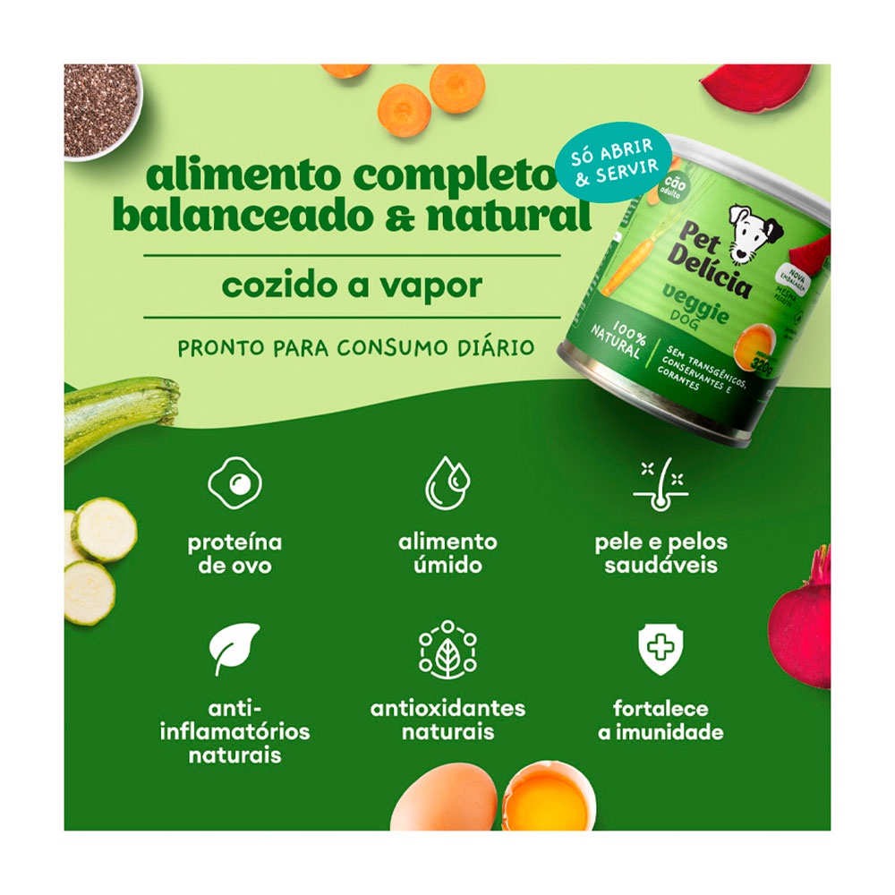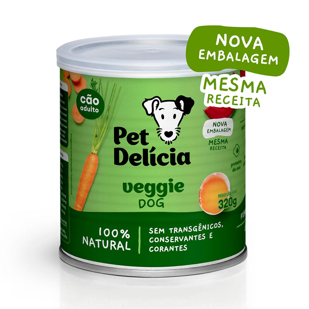Ração Úmida Para Cães Adultos Pet Delícia Veggie 320g - Indicado para cães adultos; - Contém ovos como fonte de proteína e legumes frescos;- Contém antioxidantes e anti-inflamatórios naturais; - Rica em ômegas 3 e 6; - Auxilia para uma pele saudável e pelos com brilho;- Rico em fibras, prebióticos e beta-glucanos. Ração Úmida Pet Delícia Veggie é um alimento saboroso para o seu cãozinho. Uma receita muito bem desenvolvida com uma perfeita combinação de ovos como fonte de proteína saudável, gorduras saudáveis inclusive ômegas 3 e 6, sabor e aroma de azeite de oliva, adicionando de forma natural, carboidratos, água, minerais, proteínas, vitaminas e principalmente fibras na porção necessária contribuindo com a digestão. Pet Delícia Veggie para cães adultos contém ingredientes funcionais como alecrim e cúrcuma, e fontes de fibras como semente de chia e aveia. Modo de usar Quantidade diária recomendada. Para Cães de 1kg: 60g por dia.Para Cães de 1kg até 2,5kg: 60g a 160g por dia.Para Cães de 2,5kg até 5kg: 160g a 320g por dia.Para Cães de 5kg até 7,5kg: 320g a 480g por dia. Para Cães de 7,5kg até 10kg: 480g a 640 por dia. Acima de 10 kg acrescente mais 1 lata de 320 g para cada 5 kg de peso do cão. Introduzir de forma gradativa ao longo de 1 semana. Ingredientes Ovos, ovos desidratados, proteína de soja não transgênica, abobrinha, chuchu, cenoura, beterraba, ervilhas, brócolis, óleo de girassol, azeite de oliva, lecitina de soja não transgênica, alecrim, algas, aveia, colágeno, semente de chia, vitaminas e minerais.