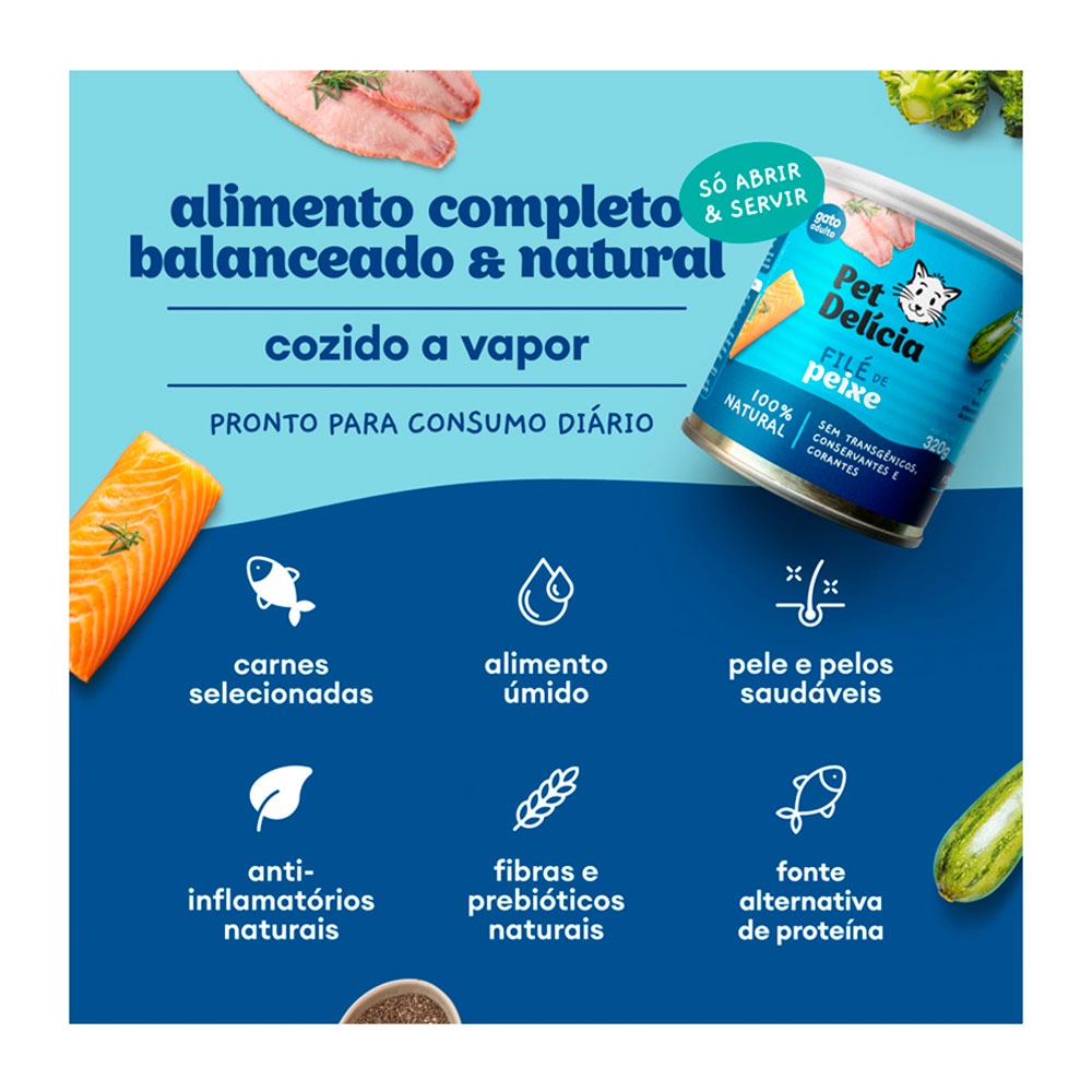 Ração Úmida Para Gatos Adultos Pet Delícia Sabor Filé de Peixe 320g - Indicado para gatos adultos;- Cortes nobres de tilápia e salmão como fonte de proteína alternativa;- Rico em fibras, prebióticos e beta-glucanos;- Rica em ômegas 3, 6e 9; - Contém anti-inflamatórios e antioxidantes naturais;- Baixo teor de carboidratos. Ração Úmida Pet Delícia Gatos Filé de Peixe é um alimento saboroso para o seu felino. Uma receita muito bem desenvolvida com uma perfeita de cortes nobres tilápia e salmão adicionando de forma natural, carboidratos, água, minerais, proteínas, vitaminas e principalmente fibras na porção necessária contribuindo com a digestão. Pet Delícia Filé de Peixe para gatos é ideal como proteína alternativa e é recomendada para trazer mais variedade no cardápio do seu gatinho. Com ômegas 3, 6 e 9 ideais para promover uma pele saudável e pelos brilhantes. Com antioxidantes e anti-inflamatórios naturais, fibras, prebióticos e beta-glucanos. Modo de usar Quantidade diária recomendada. Para Gatos de 1kg: 70g por dia.Para Gatos de 1kg até 2,5kg: 70g a 170g por dia.Para Gatos de 2,5kg até 5kg: 170g a 345g por dia.Para Gatos de 5kg até 7,5kg: 345g a 515g por dia. Para Gatos de 7,5kg até 10kg: 515g a 685g por dia. Acima de 10 kg acrescente mais 1 lata de 320 g para cada 5 kg de peso do cão. Introduzir de forma gradativa ao longo de 1 semana. Ingredientes Tilápia, salmão, chuchu, abobrinha, beterraba, batata doce, brócolis, óleo de girassol, azeite de oliva, arroz parboilizado, arroz integral, semente de chia, aveia em flocos, lecitina de soja não transgênica, carbonato de cálcio, fosfato bicálcico, algas, alecrim, levedo seco de cervejaria e taurina.