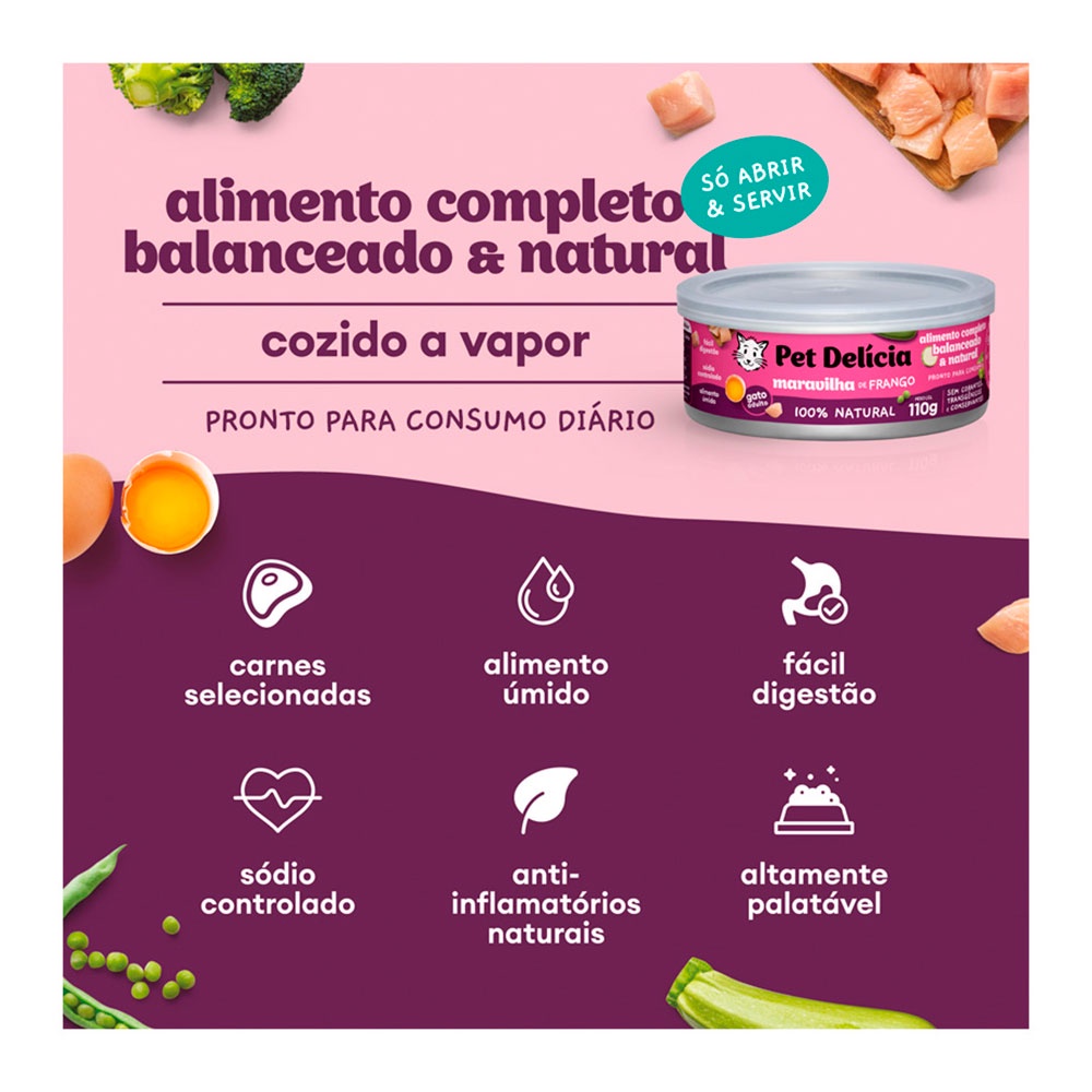 Ração Úmida Para Gatos Adultos Pet Delícia Sabor Maravilha de Frango 110g - Indicado para gatos adultos;- Cortes nobres de frango e legumes frescos;- Rico em fibras, prebióticos e beta-glucanos;- Rica em ômegas 3 e 6; - Auxilia na melhora do sistema digestivo;- Baixo teor de carboidratos. Ração Úmida Pet Delícia Gatos Maravilha de Frango é um alimento saboroso para o seu felino. Uma receita muito bem desenvolvida com uma perfeita de cortes nobres frabgo e legumes frescos adicionando de forma natural, carboidratos, água, minerais, proteínas, vitaminas e principalmente fibras na porção necessária contribuindo com a digestão. Pet Delícia Maravilha de Frango para gatos é ideal para cuidar do trato urinário, contém gorduras saudáveis, ômegas 3 e 6 para uma pele saudável e pelos com brilho, e fibras e prebióticos que melhoram o sistema digestivo do gato. Modo de usar Quantidade diária recomendada. Para Gatos de 1kg: 62g por dia.Para Gatos de 1kg até 2,5kg: 62g a 156g por dia.Para Gatos de 2,5kg até 5kg: 156g a 312g por dia.Para Gatos de 5kg até 7,5kg: 312g a 467g por dia. Para Gatos de 7,5kg até 10kg: 467g a 623g por dia. Acima de 10 kg acrescente mais 1 lata de 320 g para cada 5 kg de peso do cão. Introduzir de forma gradativa ao longo de 1 semana. Ingrediente Peito de frango, moela de frango, ovos, abobrinha, chuchu, cenoura, ervilhas, brócolis, óleo de girassol, lecitina de soja não transgênica, aveia em flocos, algas, levedura seca de cervejaria, taurina, vitaminas.