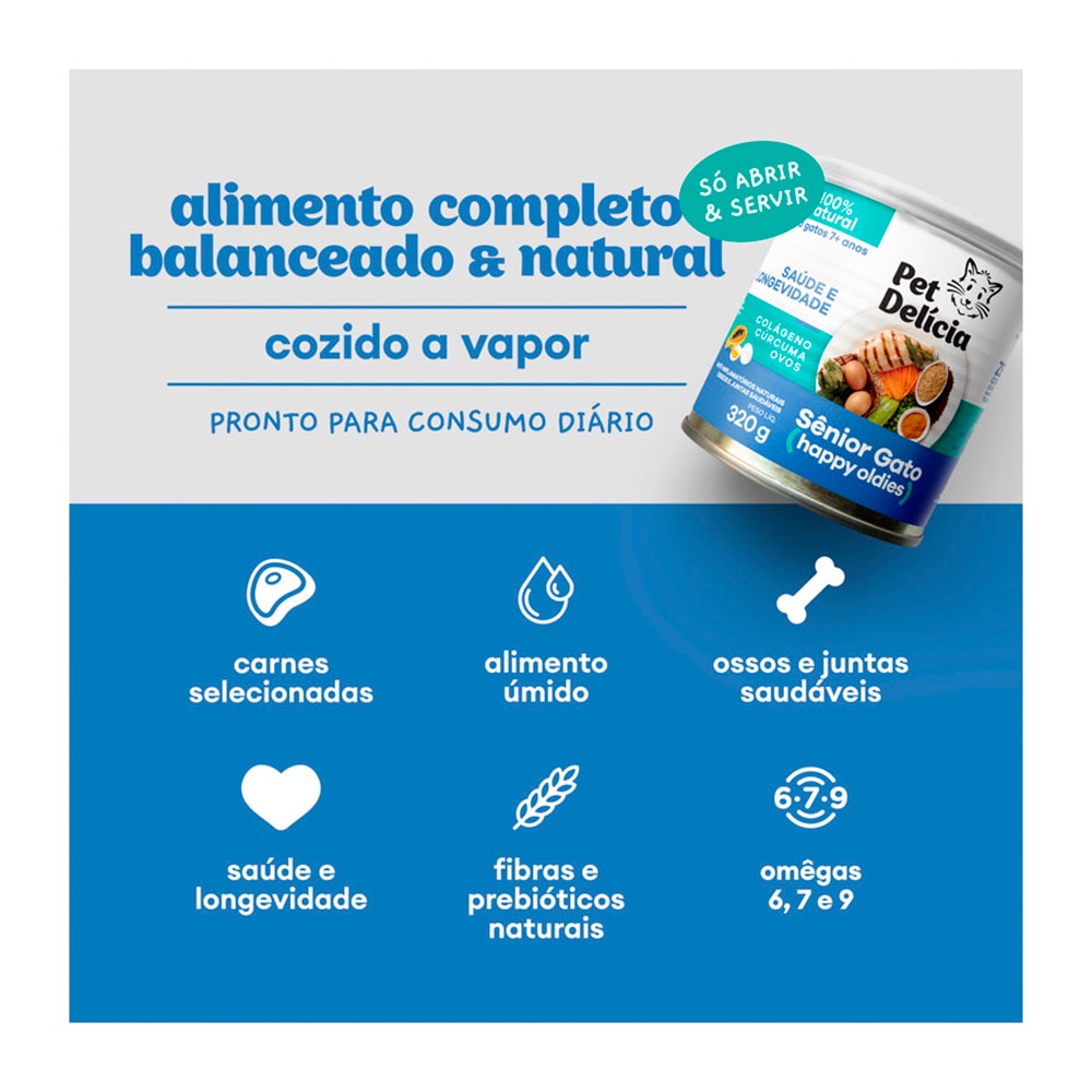 Ração Úmida Para Gatos Adultos Sênior Pet Delícia 320g - Indicado para gatos adultos; - Para gatos adultos sêniores a partir dos 7 anos; - Cortes nobres de frango, ovos e moela de frango; - Contém colágeno para cuidado das juntas e ossos; - Rica em ômegas 3, 6 e 9; - Possui gengibre para melhorar imunidade; - Auxilia para uma pele saudável e pelos com brilho; - Baixo teor de carboidratos. Ração Úmida Pet Delícia Gatos Sênior é um alimento saboroso para o seu felino. Uma receita muito bem desenvolvida com uma perfeita de cortes nobres frango, ovos e moela de frango adicionando de forma natural, carboidratos, água, minerais, proteínas, vitaminas e principalmente fibras na porção necessária contribuindo com a digestão. Pet Delícia Sênior para gatos idosos é ideal para cuidar dos gatinhos em idade mais avançada, contém vitaminas e minerais otimizados para saúde dos olhos e cerebral, enriquecemos essa receita com colágeno para cuidar das juntas e dos ossos, algas como fontes de ômega 3, gorduras saudáveis através do azeite de oliva e óleo de coco, cúrcuma e mamão (prebióticos e ação anti-inflamatória). Modo de usar Quantidade diária recomendada. Para Gatos de 1kg até 2,5kg: 80g a 160g por dia.Para Gatos de 2,5kg até 5kg: 160g a 320g por dia.Para Gatos de 5kg até 7,5kg: 320g a 480g por dia. Para Gatos de 7,5kg até 10kg: 480g a 640g por dia. Acima de 10 kg acrescente mais 1 lata de 320 g para cada 5 kg de peso do cão. Introduzir de forma gradativa ao longo de 1 semana. Ingrediente Peito de frango, moela de frango, ovos, abobrinha, chuchu, mamão, cenoura, batata doce, brócolis, ervilhas, óleo de girassol, lecitina de soja não transgênica, óleo de coco, aveia, colágeno, semente de chia, algas, açafrão da terra (curcumina), alecrim, arroz parboilizado, arroz integral, taurina, vitaminas e minerais.