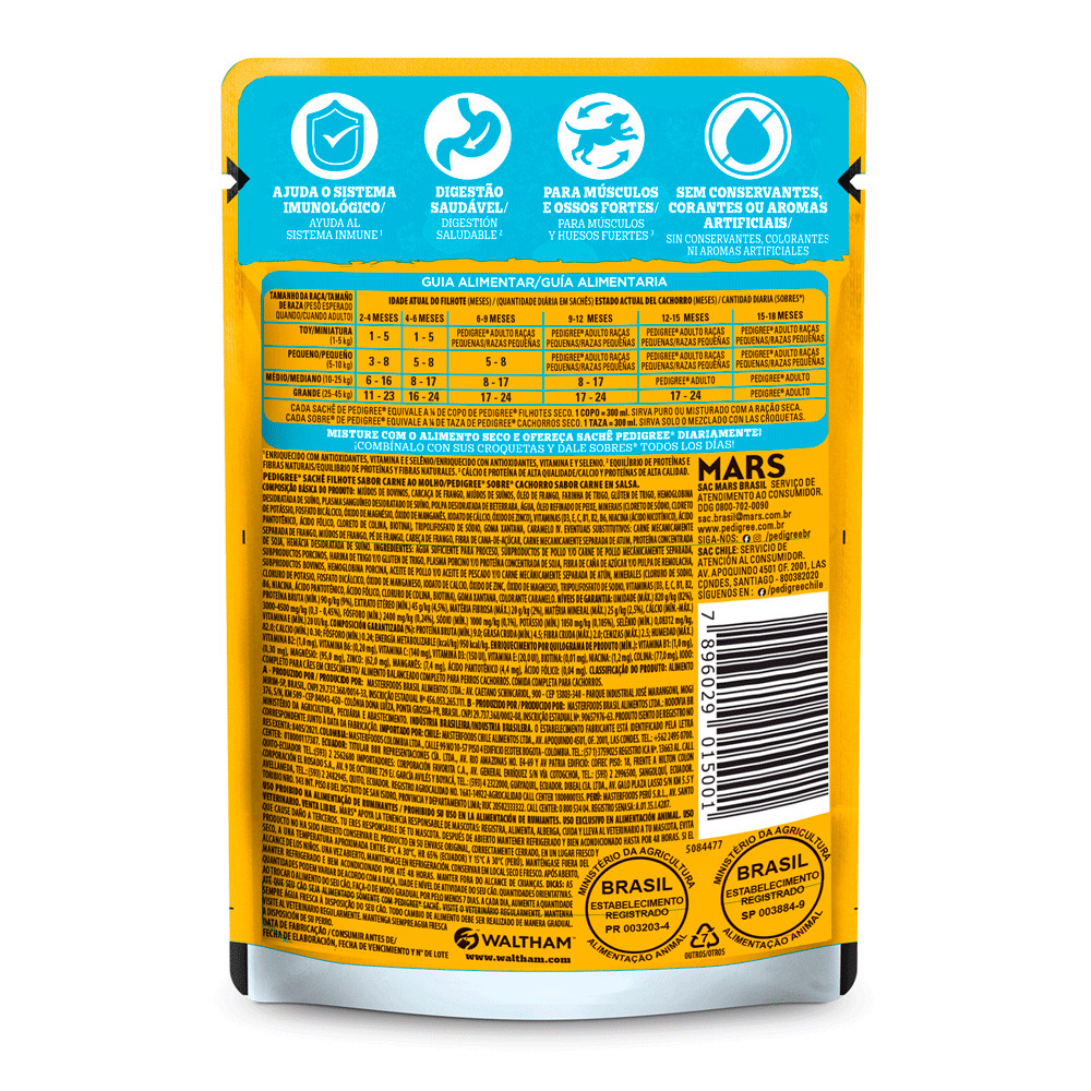 Ração Úmida Pedigree Sachê Cães Filhote Carne ao Molho A Ração Úmida Pedigree Sachê Filhote Carne ao Molho tem tudo o que você precisa para oferecer um alimento muito saboroso e de qualidade para o seu cãozinho.Com pedacinhos suculentos de carne cozida a vapor e um molho com sabor e aroma irresistíveis, o alimento é rico em fibras que vão ajudar seu cachorro a produzir fezes mais firmes e fáceis de limpar.Se o seu filhote vive em um ambiente interno, como um apartamento, isso torna a convivência de vocês ainda melhor, pois facilita muito na manutenção do dia a dia. A ração também é fonte rica em cálcio e fósforo, que são elementos essenciais para que o filhote cresça e se desenvolva com muita saúde e energia.