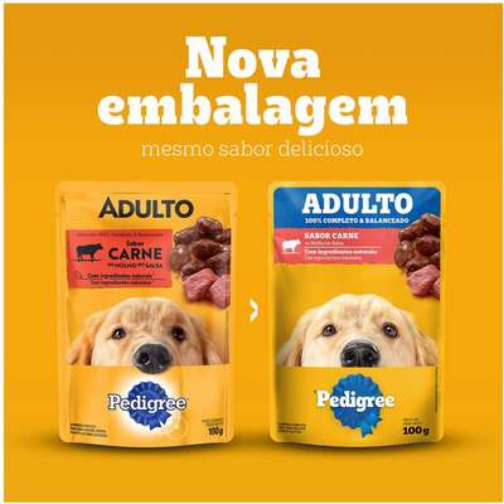 Ração Úmida Pedigree Sachê para Cães Adultos 100g - 18 unidades Refeição completa e saborosa Proporcione ao seu cão uma refeição 100 porcento completa e balanceada com a Ração Úmida Pedigree Sachê. Com ingredientes de alta qualidade, esta deliciosa opção é ideal para manter o seu cão saudável e cheio de energia. Sem conservantes, corantes e aromas artificiais, os suculentos pedacinhos são cozidos a vapor, preservando o sabor e os nutrientes essenciais. Além disso, o balanço ideal de fibras proporciona fezes firmes e fáceis de limpar. Para garantir a qualidade e frescor do alimento, conserve-o em local seco e fresco. Após aberto, mantenha refrigerado e bem acondicionado por até 48 horas. Lembre-se de que as quantidades podem variar de acordo com a raça, idade e nível de atividade do seu cão. A transição alimentar deve ser feita de forma gradual ao trocar o alimento do seu cão. Durante pelo menos 7 dias, aumente gradualmente a quantidade da Ração Úmida Pedigree Sachê até que ele seja alimentado exclusivamente com esse produto. Não se esqueça de visitar regularmente o veterinário para garantir a saúde do seu cão. A quantidade recomendada varia de acordo com o porte do seu cão: Toy (1/5 kg): 1 4 sachês por dia Pequeno (5/10 kg): 4 6 sachês por dia Médio (10/25 kg): 6 12 sachês por dia Grande (25/45 kg): 12 17 sachês por dia Cada sachê de Pedigree equivale a 1/5 de copo de Pedigree adulto seco. Sirva puro ou misturado com a ração seca para uma experiência ainda mais saborosa. Proporcione uma alimentação de qualidade e saborosa para o seu cão com a Ração Úmida Pedigree Sachê. Com PEDIGREE, seu cão recebe os cuidados que ele merece