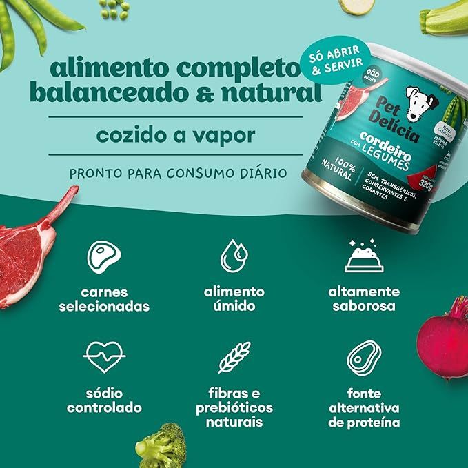 Ração Úmida Pet Delícia Cães Cordeiro Com Legumes - 320g - Indicado para cães; - Para cães adultos; - Alimento natural, balanceado e completo; - Rica em ômegas 3, 6 e 9; - Alta digestibilidade; - Fonte de proteína alternativa. A Ração Úmida Para Cães Pet Delícia Cordeiro Com Legumes ? 320g é uma deliciosa receita super premium com cortes de carne de cordeiro e legumes frescos criando um alimento balanceado para o seu cãozinho. Sem pózinhos esquisitos, corantes, transgênicos, sabores artificiais ou conservantes, dentro da lata, só o que seu companheiro precisa para viver saudável e feliz por muito mais tempo! A ração úmida Pet Delícia é 0% conservantes, corantes, sabores artificiais e também é0% transgênica. É uma ótima opção que oferece mais variedade na hora da refeição do seu pet além de ser um alimento natural. Recomendação Diária Indicação de consumo sugerida considerando a necessidade calórica diária, sujeito adaptações por atividade física ou metabolismo individual. Para saber exatamente a quantidade de acordo com o peso do seu cão CLIQUE AQUI. Peso (kg) Quantidade diária (g) 1-6 85g ? 320g (1 lata) 6-14,5 320g ? 640g (2 latas) 14,5-25 640g ? 960g (3 latas) 25-36,5 960g ? 1280g (4 latas) 36,5-49 1280g ? 1600g (5 latas) Acima de 49 quilos acrescente mais 1 lata para cada 14 quilos de peso do cão. Introduzir de forma gradativa ao longo de 1 semana. Sugere-se adequar a quantidade proporcionalmente como complemento (cada 100g deste alimento equivale aprox. 30g de ração seca). Ingredientes Fontes de proteína: cordeiro Legumes: abobrinha, chuchu, brócolis, beterraba, ervilhas Óleos: óleo de girassol e lecitina não transgênica Cereais: arroz parboilizado e arroz integral Funcionais: aveia, semente de chia, colágeno, algas, alecrim, açafrão da terra (curcumina) e pimenta preta (piperina) Enriquecimento: vitaminas e minerais