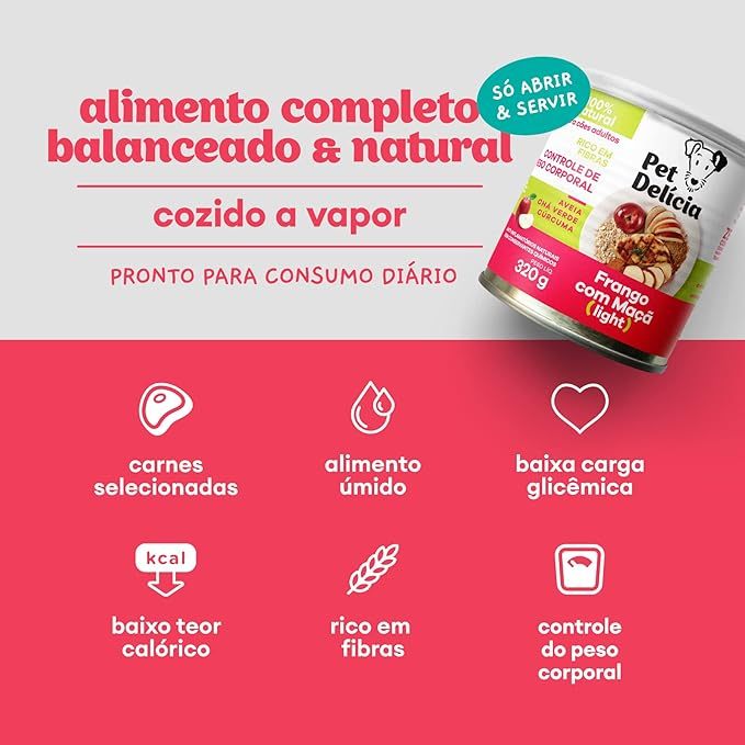 Racao Umida Pet Delicia Caes Frango com Maca Light - 320g - Indicado para caes; - Controle de peso e gordura corporal; - Para caes de paladar exigente; - Sodio controlado; - Rica em fibras; - Com ingredientes termogenicos. O Alimento Natural Pet Delicia Frango com Maca Fit e uma receita gourmet formulada com cortes nobres de frango, legumes e deliciosas macas vermelhas sem semente. Mesmo com todo sabor e aroma que possui e uma receita light com baixas calorias e baixo teor de carboidratos oferecendo baixo indice e carga glicemica. Rica em omegas 3 e 6, ingredientes termogenicos, antioxidantes e anti-inflamatorios naturais. Indicada para controle de peso e gordura corporal ou ainda para caes de paladar exigente que necessitam de uma dieta saborosa e saudavel. Sem pozinhos esquisitos, corantes, transgenicos, sabores artificiais ou conservantes, dentro da lata, so o que seu companheiro precisa para viver saudavel e feliz por muito mais tempo! Por ser um alimento umido (em torno de 70-80% de umidade), a Pet Delicia Frango com Maca Light tambem ajuda na hidratacao do seu cachorro, prevenindo doencas renais. Pet Delicia Light e ideal para quem quer oferecer um alimento saudavel, delicioso e sempre fresquinho para seu peludo, mas nao tem tempo de preparar uma refeicao balanceada e completa. E so abrir a latinha e servir! A Pet Delicia Frango com Maca e uma receita livre de graos como trigo, milho ou soja que sao de baixa qualidade e normalmente causam alergia ao cao. Recomendacao diaria Indicacao de consumo sugerida considerando a necessidade calorica diaria, sujeito adaptacoes por atividade fisica ou metabolismo individual. Para saber exatamente a quantidade de acordo com o peso do seu cao CLIQUE AQUI. Peso do animal (kg) Quantidade (g) 1-6 80-320 g 6-16 320-640 g 16-27 640-960 g 27-40 960-1280 g 40-54 1280-1600 g Acima de 54 quilos acrescente mais 1 lata de 320g para cada 15 quilos de peso do cao. Sugere-se adequar a quantidade proporcionalmente como complemento (cada 100g deste alimento equivale aprox. 25g de racao seca). Ingredientes Proteina: peito de frango, moela de frango Legumes: batata doce, chuchu Oleos: oleo de girassol, lecitina de soja nao transgenica Funcionais: maca, cha verde, alecrim, algas, aveia em flocos, semente de linhaca, levedura seca, curcuma e pimenta preta (piperina) Enriquecimento: vitaminas e minerais