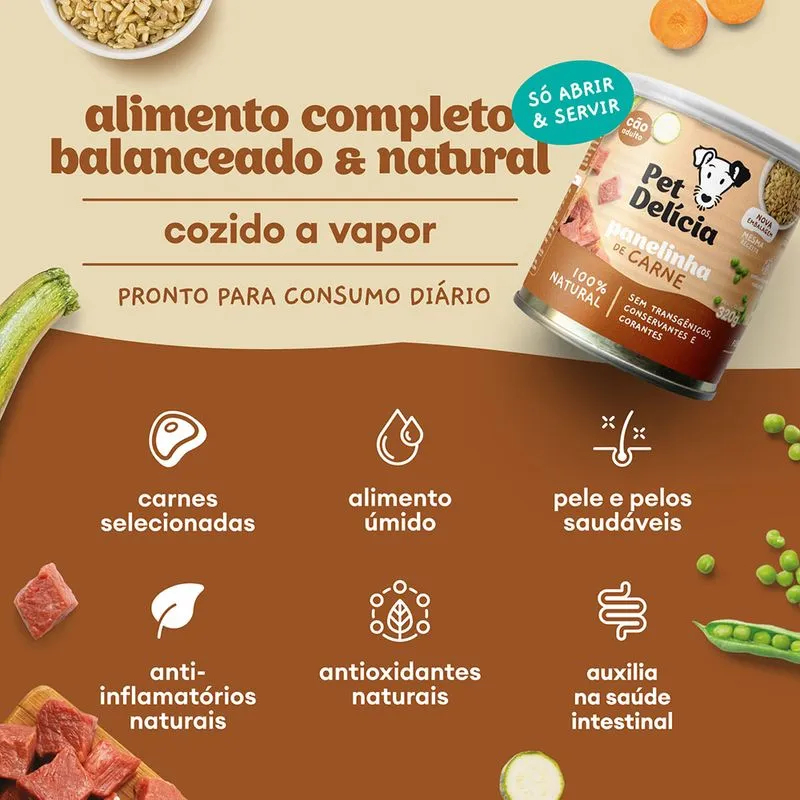 Racao Umida Pet Delicia Caes Panelinha de Carne - 320g - Ideal para caes; - Para caes com digestao lenta; - Rico em fibras; - Sem conservantes e corantes; - Hidratacao ideal; - Com antioxidantes e anti-inflamatorios naturais. A racao umida Pet Delicia Panelinha de carne para Caes, e desenvolvida especialmente para caes que tenham uma digestao um pouco mais lenta. E uma deliciosa receita balanceada para caes, feita com cortes nobres de carne bovina, arroz, legumes, vitaminas e minerais. Receita rica em omegas 3 e 6, antioxidantes e anti-inflamatorios. Indicada para animais que tem paladar exigente e gostam do sabor de carne bovina ou que tem uma digestao lenta e precisam de uma dieta leve e de facil digestao. Pet Delicia contem carne e legumes frescos de alta qualidade (nada de subprodutos como farinha de visceras, etc), a Pet Delicia Panelinha de Carne oferece ao seu peludo uma melhor digestao e absorcao dos nutrientes. O sabor original dos ingredientes estimula o apetite de caes mais exigentes ou com pouco apetite e sua consistencia facilita a mastigacao dos debilitados. Sem pozinhos esquisitos, corantes, transgenicos, sabores artificiais ou conservantes, dentro da lata, so o que seu companheiro precisa para viver saudavel e feliz por muito mais tempo! Recomendacao Diaria Indicacao de consumo sugerida considerando a necessidade calorica diaria, sujeito adaptacoes por atividade fisica ou metabolismo individual. Para saber exatamente a quantidade de acordo com o peso do seu cao CLIQUE AQUI. Peso do animal (kg) Quantidade (g) 1-6 83-320 6-15,5 320-640 15,5-26,5 640-960 26,5-39 960-1280 39-52 280-1600 Acima de 52 quilos acrescente mais 1 lata de 320g para cada 15kg de peso do cao. Introduzir de forma gradativa ao longo de 1 semana. Sugere-se adequar a quantidade proporcionalmente como complemento (cada 100g deste alimento equivale aprox. 30g de racao seca). Ingredientes Proteina: carne bovina, coracao bovino, lingua bovina Graos: arroz parboilizado, arroz integral Legumes: abobrinha, cenoura, inhame, ervilhas, chuchu Oleos: oleo de girassol, lecitina de soja nao transgenica Funcionais: alecrim, algas, acafrao da terra (curcumina), pimenta preta (piperina), aveia em flocos, semente de linhaca, levedura seca Enriquecimento: vitaminas e minerais