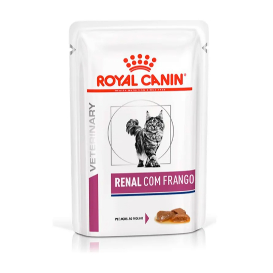 Ração Úmida Royal Canin Veterinary Diet Renal para Gatos com Insuficiência Renal - 12 sachês de 85g Descrição - Indicada para gatos adultos; - Baixo nível de fósforo e moderado nível de proteína de alta qualidade para apoiar a função renal; - Conteúdo de energia adaptado para reduzir o volume das refeições e ajudar a compensar a diminuição do apetite; - Um perfil aromático específico com uma textura dedicada para ajudar a estimular o apetite do gato; - Disponível em embalagem com 85g.