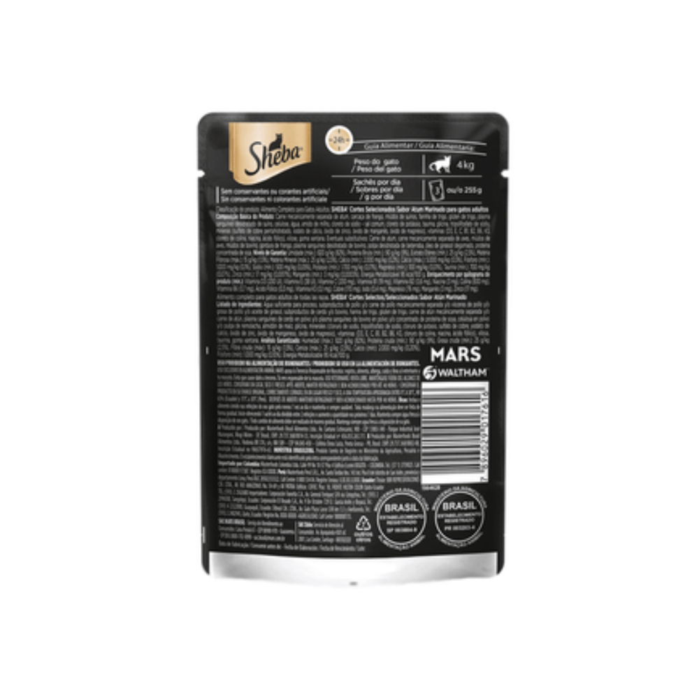 Alimento Super Premium 100 completo e balanceado para gatos filhotes. Sem conservantes ou corantes artificiais. Deliciosos pedacinhos feitos com ingredientes selecionados. Desperte seus sentidos com cortes selecionados. É impossível resistir. Sheba acredita que gatos são felinos verdadeiramente especiais, além de serem elegantes e confiantes, sabem usar o charme para conseguirem o que querem como ninguém. Então, quando os gatos querem Sheba não dá para resistir. Sheba oferece uma linha de alimento úmido 100 completo e balanceado, sem conservantes ou corantes artificiais e que garante a combinação perfeita entre sabor e nutrição. As receitas de Sheba são desenvolvidas com base na ciência do Centro de Pesquisas Waltham, a maior autoridade mundial no cuidado e nutrição de animais de estimação. Conservar em local seco e fresco. Após aberto manter refrigerado e bem acondicionado por até 48 horas.