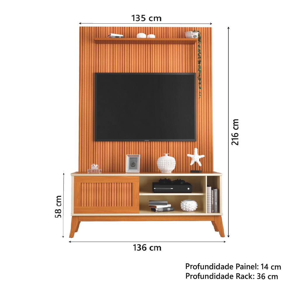 Rack Bancada Aruba Com Painel Para TV Até 55 Polegadas 1,35m Egeo Cedro/Off White Ripado Impressão 3D EDN