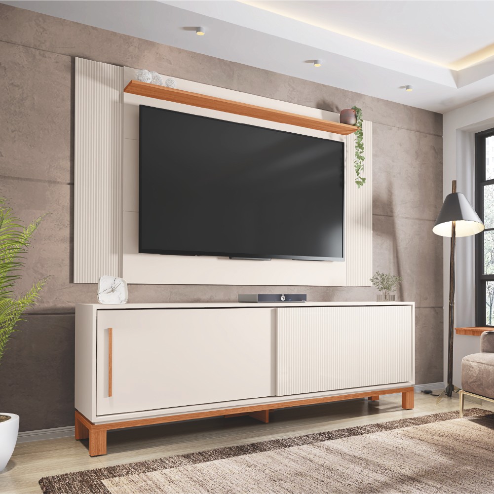 Transforme sua sala de estar com o Conjunto Rack Bancada e Painel Dubai! um móvel sofisticado que une elegância e funcionalidade. Projetado para acomodar TVs de até 65 polegadas, ele oferece espaço ideal para organizar seus eletrônicos e decorar o ambiente com estilo. O acabamento Ripado com impressão em 3D traz um toque moderno e refinado, enquanto as portas de correr garante praticidade e suavidade ao abrir e fechar. Perfeito para quem busca beleza, organização e qualidade em um só produto! MEDIDAS DO RACK: A = 61,9 cm L = 179 cm P = 37,9 cm MEDIDAS DO PAINEL: A = 1,08 cm L = 180 cm P = 17,5 cm MEDIDAS DOS PÉS: A = 10 cm L = 6 cm P = 4 cm PAINEL SUPORTA ATÉ: 15 kg RACK SUPORTA ATÉ: 30 kg PESO: 60,5 kg PRATELEIRA SUPORTA ATÉ: 2 kg IDEAL PARA TV DE ATÉ: 65 Polegadas MODELO: Rack Bancada com Painel para TV até 65 Polegadas Ripado impressão 3D 2 Portas Dubai MARCA: Caemmun COR: Madeirado / Off White PINTURA: UV ACABAMENTO: Brilho MATERIAL: MDP ESPESSURA DO MATERIAL DA ESTRUTURA: 15mm e 25mm / 12mm PORTAS: 2 (Deslizante) PUXADOR: MDF TIPO DE PUXADOR: Retangular QUANTIDADE DE PUXADOR: 1 PRATELEIRAS: 3 PÉS: MDF QUANTIDADE DE PÉS: 4 DIFERENCIAL: Detalhe Ripado Impressão 3D, Puxador e pés em MDF, Porta deslizante. ITENS INCLUSOS: 1 Rack, 1 Painel, 1 Manual de montagem, 1 Kit Parafusos INSTRUÇÕES/CUIDADOS: Para maior durabilidade, recomendável que a limpeza dos móveis seja feita com pano limpo e levemente umedecido em água e sabão neutro. Em seguida, deverá ser passado um pano limpo e seco. GARANTIA: 3 meses pelo fabricante A Esplanada Móveis se responsabiliza pela entrega dos produtos adquiridos até a porta de entrada ou portaria do endereço indicado, se a portaria do condomínio permitir, as entregas são efetuadas no piso térreo e é de responsabilidade do cliente a locomoção da mercadoria até seu apartamento ou casa. Confira as dimensões do produto e certifique-se de que estão adequadas aos elevadores, portas e corredores do local da entrega. Não fazemos a montagem, desmontagem do produto e/ou portas e janelas, locomoção pela escada ou içamento pelo lado de fora do prédio. Não está incluso na entrega o deslocamento até o interior do apartamento, com ou sem elevador, ou deslocamento em locais de difícil acesso como escadarias. Caso o cliente necessite de entrega dentro das dificuldades mencionadas, deverá entrar em contato para análise e dúvidas. Certifique-se de tudo antes de finalizar a compra, evitando assim futuros desagrados ou imprevistos com a entrega.