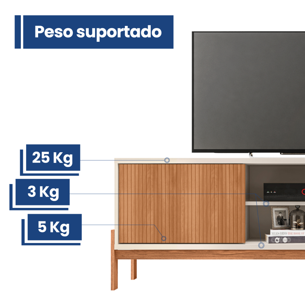 A Bancada Tiger irá completar seu ambiente, possui elegância além de um design único e exclusivo. Suporta Televisores de até 72 Polegadas além de possuir 2 portas de correr um com amplo espaço de armazenamento. Feito em MDP e HDF possui maior durabilidade e resistência, transmitindo maior segurança ao móvel. Dimensões do Produto: - Peso: 35,5 kg; - Altura: 62,6 cm; - Largura: 184,2 cm; - Profundidade: 36 cm. Características Técnicas: - Possui 5 Pés; - Possui 2 Portas; - Possui 2 Nichos; - Suporta Televisores até 72 Polegadas; - Contém furação para passagem de fios; - Tonalidade do Produto: Freijo/ Off White; - Estrutura em MDP de 18mm de espessura. HDF de 3mm de espessura. Peso Suportado: - Nicho 3 kg; - Base 10 kg; - Tampo 25 kg. - Acompanha manual de montagem; - Garantia 90 dias contra defeito de fabricação; - Este móvel chegará em sua casa separado em 1 volume. Dimensões do Volume: - Altura: 8 cm; - Largura: 184,2 cm; - Comprimento: 36 cm. Recomendações de limpeza: - Limpar com pano macio, seco ou úmido, sem uso de produtos abrasivos. Pois, podem trazer danos ao produto. Sobre a entrega: - As transportadoras contratadas, não realizam entregas em apartamentos. Realizando assim a entrega na portaria do prédio. *Produto segue desmontado, montagem por conta do comprador; *Imagens do produto são meramente ilustrativas; *Ripado Decorativo em Finish Foil, feito em chapa revestida com acabamento imitando ripado de forma realista.