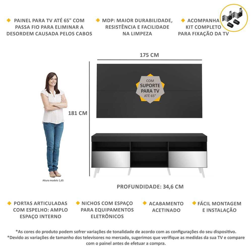 Rack c/ Painel e Suporte TV 65" c/ Espelho e Pés Retrô Flórida Multimóveis Preto/Branco