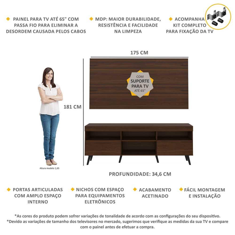 A sala de estar é o melhor lugar para receber a família e amigos, por isso ter um ambiente bonito e aconchegante é fundamental. O Rack com Painel e Suporte para TV até 65" e Pés Retrô Flórida Multimóveis é uma ótima opção para aproveitar seu espaço de maneira inteligente. Produzido em MDP com pintura UV, que garante maior durabilidade e facilidade na limpeza, possui espaço para os equipamentos eletrônicos e nichos para objetos decorativos, além de duas portas articuladas com um amplo espaço interno para manter seus pertences organizados. O painel para TV de até 65” possui espaçamento para passagem dos fios, que permite deixar os cabos mais organizados. Para facilitar a sua vida, este produto acompanha também o kit para fixação da TV. Muito prático e de fácil instalação, pode ser utilizado para TV’s LCD, LED e plasma de 14” a 71”. Totalmente sobreposto, acompanha gabarito de montagem que auxilia na instalação. Conta com um sistema de encaixe rápido, possui 16mm de deslocamento que permite o ajuste do encaixe das peças. Os pés palito, estilo retrô, em polipropileno, dão um charme especial ao móvel deixando-o com um visual leve e permitindo você compor um ambiente com ar vintage e moderno ao mesmo tempo. Conteúdo da Embalagem: 1 (um) painel 1 (um) rack 1 (um) kit com suporte para TV 1 (um) kit com 6 pés retrô Kit ferragem Manual de Montagem Dimensões do produto montado: Altura: 181cm | Largura: 175cm | Profundidade: 34,6cm Painel - Altura: 90cm | Largura: 175cm | Profundidade: 2,5cm Rack - Altura: 63,6cm | Largura: 175cm | Profundidade: 34,6cm *Você pode consultar as medidasdetalhadas na imagem técnica do produto. *Devido as variações de tamanho dos televisores no mercado, sugerimos que verifique as medidas da sua TV e compare com o painel antes de efetuar a compra. *As cores do produto podem sofrer variações de tonalidade de acordo com as configurações do seu dispositivo. Imagem meramente ilustrativa. Decoração e eletros não acompanham o produto. O produto será entregue desmontado e não disponibilizamos o serviço de montagem.