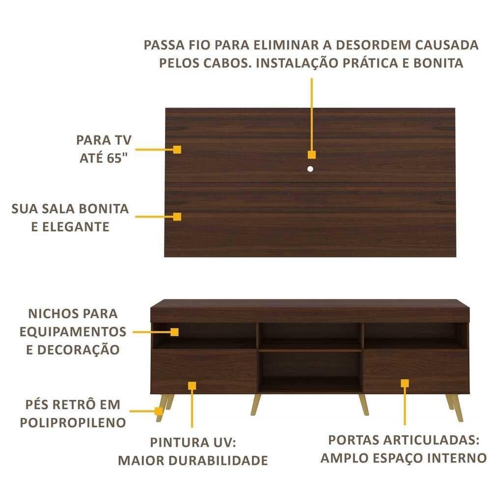 A sala de estar é o melhor lugar para receber a família e amigos, por isso ter um ambiente bonito e aconchegante é fundamental. O Rack com Painel P/TV até 65" e Pés Retrô Flórida Multimóveis é uma ótima opção para aproveitar seu espaço de maneira inteligente.Produzido em MDP com pintura UV, que garante maior durabilidade e facilidade na limpeza, possui espaço para os equipamentos eletrônicos e nichos para objetos decorativos, além de duas portas articuladas com um amplo espaço interno para manter seus pertences organizados. O painel P/TV de até 65” possui espaçamento para passagem dos fios, que permite deixar os cabos mais organizados. Devido as variações de tamanho dos televisores no mercado, sugerimos que verifique as medidas da sua TV e compare com o painel antes de efetuar a compra. Os pés palito, estilo retrô, em polipropileno, dão um charme especial ao móvel deixando-o com um visual leve e permitindo você compor um ambiente com ar vintage e moderno ao mesmo tempo. Conteúdo da Embalagem: 1 (um) Rack 1 (um) Painel Kit ferragem Manual de Montagem Dimensões do produto montado: Painel - Altura: 90cm | Largura: 175cm | Profundidade: 2,5cm Rack - Altura: 63,6cm | Largura: 175cm | Profundidade: 34,6cm *Devido as variações de tamanho dos televisores no mercado, sugerimos que verifique as medidas da sua TV e compare com o painel antes de efetuar a compra. As cores do produto podem sofrer variações de tonalidade de acordo com as configurações do seu dispositivo. Imagem meramente ilustrativa. Decoração não acompanha o produto. O produto será entregue desmontado e não disponibilizamos o serviço de montagem.