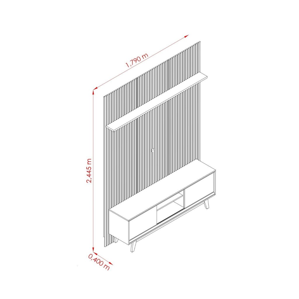 Painel em MDF frisado (baixo relevo), portas deslizantes frisadas que se sobrepõem, pés retrô e estrutura com chapas em MDP e MDF de 1,2 /1,5 e 2,5cm. Portas deslizantes; Painéis em MDP 1,2/1,5 e 2,5cm. Fixação com minifix. Garantia: 03 Meses Altura (cm): 303 Acabamento: Pintura UV Largura (cm): 179 Possui Pés: Sim Peso do Rack: 33.8 Possui Vidro: Não Possui Nichos: Não Possui Portas: Sim Altura do Rack: 58.5 Altura dos Pés: 18 Peso do Painel: 73 Possui Gavetas: Não Possui Rodízio: Não Possui Tomadas: Não Suporta Até (kg): 45 Largura do Rack: 164 Possui Espelhos: Não Profundidade (cm): 36.5 Altura do Painel: 244.5 Escala de Brilho: Semi-Brilho Material dos Pés: MDP Acabamento Ripado: Frisado Fixação na Parede: Sim Largura do Painel: 179 Material da Porta: MDP Possui Iluminação: Não Acabamento dos Pés: Pintura Ambiente Principal: Sala de Estar Espessura do Tampo (mm): 15 Material Principal: MDF/MDP Possui Passa Cabos: Sim Possui Prateleiras: Sim Acabamento da Porta: Pintura UV Espessura do Painel: 18.5 Sapatas Niveladoras: Não Profundidade do Rack: 36.5 Material da Prateleira: MDP Acabamento da Prateleira: Pintura UV Tipo de Puxador da Porta: Embutido Escala de Brilho da Porta: Semi-Brilho Peso Máximo por Prateleira: 5 Ideal para TVs até (Polegadas): 65 Acompanha Manual de Instalação: Sim Escala de Brilho da Prateleira: Semi-Brilho Suporte de TV Universal Incluso: Não Tipo de Dobradiça/Corrediça da Porta: Plástica Marca: Madetec Cor: Cumaru/Opala Cor do Produto: Cumuru/Opala Itens Inclusos: 1 Rack, 1 Painel, Manual de Montagem e Kit de Ferragens Cor Predominante: Marrom Quantidade de Prateleiras: 01 Prateleira Quantidade de Portas: 2 Portas
