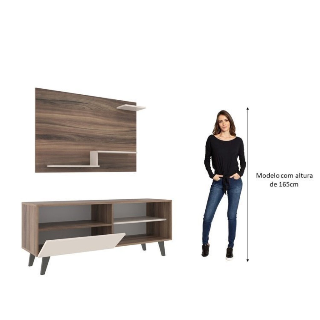 Painel Denver suporta uma TV até 42" na cor Nogueira com as prateleira na cor Off White, tem a sua altura 90 cm, comprimento de 110 centímetros e 15 cm de profundidade com prateleira de 15 mm. Painel compacto perfeito para ambientes pequenos. Rack Detroit com pés retro, tem sua altura de 53,5 cm, comprimento de 136 cm e profundidade de36 cm, pesa 22,05 kg, este móvel é exclusivo para salas, mas pode ser utilizado em outros ambientes, tem uma porta basculante. Medidas Painel (AxLxP): 90x110x15 cm Medidas Rack (AxLxP): 54x136x36 cm. Garantia: 03 Meses Altura (cm): 144 Acabamento: Finish Foil Largura (cm): 110 Possui Pés: Sim Possui Portas: Sim Altura do Rack: 53.5 Possui Gavetas: Não Possui Rodízio: Não Profundidade (cm): 15 Altura do Painel: 90 Acabamento Ripado: Não possui Altura do Conjunto: 90 Ambiente Principal: Sala de Estar Material Principal: MDP Largura do Conjunto: 136 Ideal para TVs até (Polegadas): 42 Marca: Espresso Móveis Cor do Produto: Nogueira Cor Predominante: Marrom