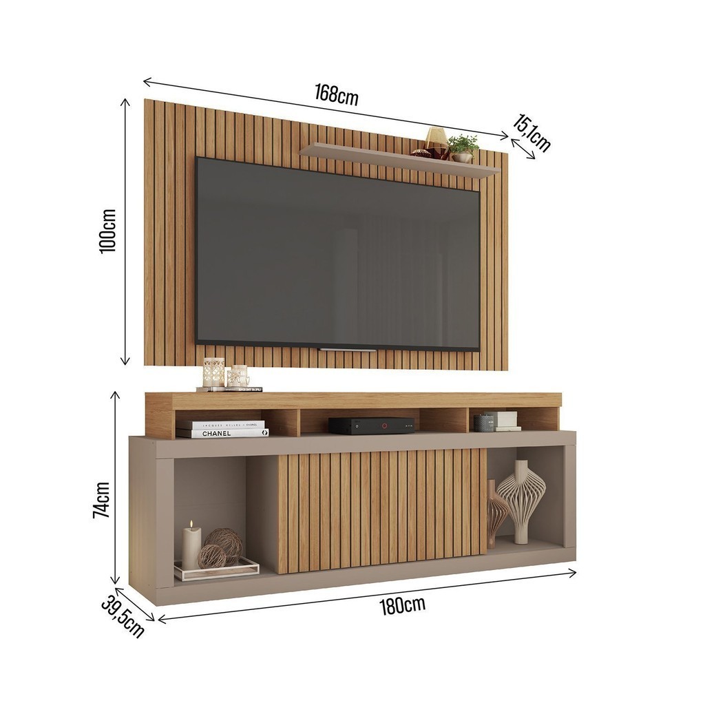 O conjunto Rack e Painel New Oscar Caemmun é a peça ideal para quem deseja modernidade e sofisticação em sua sala de estar, o painel conta com desenho ripado em 3d, proporcionando sensação de aconchego para o seu ambiente e, Um combo funcional e moderno que harmoniza facilmente com diversas decorações.Produzido em MDP e MDF que oferecem resistência e durabilidade ao móvel, esta peça é perfeita para organizar e decorar o seu ambiente. Estilo: Moderno Garantia: 03 Meses Altura (cm): 174 Acabamento: Pintura UV Largura (cm): 180 Possui Pés: Sim Peso do Rack: 37.5 Possui Vidro: Não Possui Nichos: 5 Possui Portas: Sim Tipo de Porta: Correr Altura do Rack: 74 Altura dos Pés: 3 Peso do Painel: 24.55 Possui Gavetas: Não Possui Rodízio: Sim Possui Tomadas: Não Suporta Até (kg): 93 Largura do Rack: 180 Possui Espelhos: Não Altura do Painel: 100 Escala de Brilho: Fosco Material dos Pés: Plástico Acabamento Ripado: Frisado Largura do Painel: 168 Material da Porta: MDF Origem do Produto: Nacional Possui Iluminação: Não Rodízio com Trava: Sim Altura do Conjunto: 174 Ambiente Principal: Sala de Estar Material Principal: MDF/MDP Possui Prateleiras: Sim Acabamento da Porta: Pintura UV Espessura do Painel: 15.1 Sapatas Niveladoras: Não Profundidade do Rack: 39.5 Material da Prateleira: MDP Acabamento da Prateleira: Pintura UV Profundidade do Conjunto: 39.5 Tipo de Puxador da Porta: Embutido Escala de Brilho da Porta: Fosco Peso Máximo por Prateleira: 3 Ideal para TVs até (Polegadas): 65 Material do Puxador da Porta: MDF Escala de Brilho da Prateleira: Fosco Suporte de TV Universal Incluso: Não Tipo de Dobradiça/Corrediça da Porta: Metálica Marca: Caemmun Cor Flex: Não Cor Interna: Buriti Cor: Buriti/Fendi Cor do Produto: Buriti/Fendi Itens Inclusos: 1 Painel com Rack, Kit Ferragens e Manual de Montagem Cor Predominante: Bege Quantidade de Portas: 2 Portas