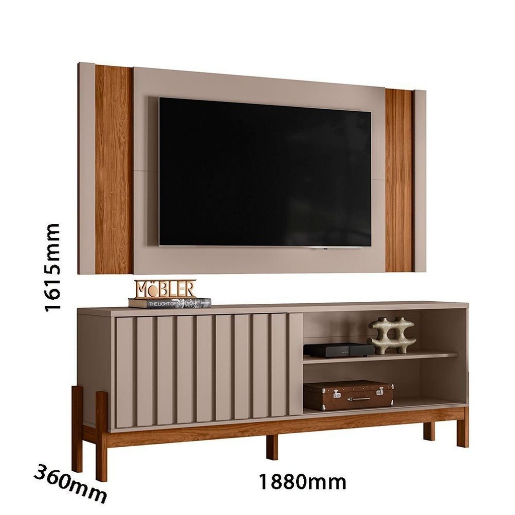 Lindo conjunto Bancada New Aurora com Painel Real. Um conjunto perfeito para sua sala. A moderna Bancada Aurora possui, pés em MDP, 1 porta ripada de correr que você pode variar o lado que quiser deixar posicionada, sempre deixando o seu ambiente de uma forma diferente, alegre e inovadora. , uma prateleira para colocar as suas decorações preferidas. O Painel Real é Extensivo, você escolhe o tamanho que desejar, de 150cm a 180cm na montagem do produto. o Painel Real suporta TV de até 65". Sua sala ficará ainda muito mais charmosa e acolhedora com este conjunto. Estilo: Moderno Garantia: 03 Meses Acabamento: Pintura UV Largura (cm): 188 Possui Pés: Sim Peso do Rack: 38 Possui Adega: Não Possui Vidro: Não Possui Nichos: 2 Possui Portas: Sim Altura do Rack: 71.5 Altura dos Pés: 19.8 Peso do Painel: 20 Possui Gavetas: Não Possui Rodízio: Não Possui Tomadas: Não Suporta Até (kg): 40 Largura do Rack: 188 Possui Espelhos: Não Profundidade (cm): 36 Altura do Painel: 90 Escala de Brilho: Semi-Fosco Material dos Pés: MDP Acabamento Ripado: Ripado Real Fixação na Parede: Sim Largura do Painel: 180 Material da Porta: MDP Origem do Produto: Nacional Possui Iluminação: Não Acabamento dos Pés: Pintura Altura do Conjunto: 161.5 Ambiente Principal: Sala de Estar Espessura do Tampo (mm): 25 Material Principal: MDP Possui Passa Cabos: Sim Possui Prateleiras: Sim Acabamento da Porta: Pintura UV Espessura do Painel: 3 Largura do Conjunto: 188 Sapatas Niveladoras: Não Profundidade do Rack: 36 Material da Prateleira: MDP Acabamento da Prateleira: Pintura UV Profundidade do Conjunto: 36 Tipo de Puxador da Porta: Embutido Escala de Brilho da Porta: Fosco Peso Máximo por Prateleira: 3 Ideal para TVs até (Polegadas): 65 Escala de Brilho da Prateleira: Fosco Informações Complementares (Novo): A bancada possui pés e tampo de 25mm, porta ripada de correr. o painel em mdp e pintura uv, painel suporta tv de até 65". Suporte de TV Universal Incluso: Não Tipo de Dobradiça/Corrediça da Porta: Plástica Marca: Mobler Cor Interna: Grigio Fosco Cor: Grigio Fosco/Cinamomo Mel Cor do Produto: Grigio Fosco/Cinamomo Mel Itens Inclusos: 1 Painel, 1 Rack, Kit Ferragem e Termo Encolhível Cor Predominante: Cinza Linha ou Coleção: New Aurora Quantidade de Prateleiras: 01 Prateleira Quantidade de Portas: 1 Porta