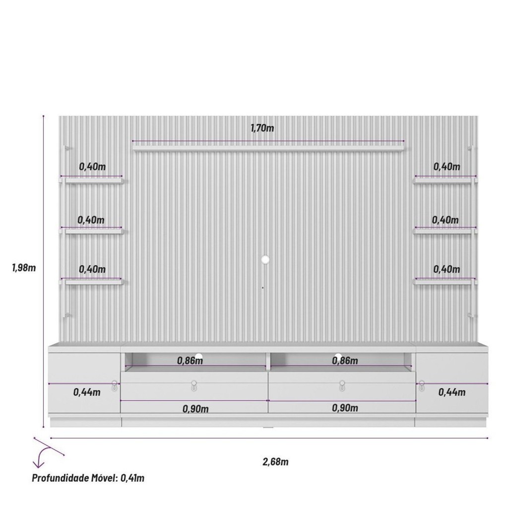 O Conjunto Rack Painel 2 Módulos laterais foi projetado para TV de até 75 polegadas. Possui tampo de 37mm de espessura, 2 gavetas e 2 portas de abrir com puxadores em couro. Conta ainda com 7 prateleiras para dispor objetos decorativos e duas hastes metálica. Seu painel ripado e a fita de Led deixam a sua sala ainda mais moderna. Peso (kg): 134.5 Garantia: 03 Meses Altura (cm): 198 Acabamento: Pintura UV Largura (cm): 268 Possui Pés: Não Peso do Rack: 53 Possui Nichos: 2 Possui Portas: Sim Tipo de Porta: Bater Altura do Rack: 50 Peso do Painel: 35 Possui Gavetas: Sim Possui Rodízio: Não Possui Tomadas: Não Suporta Até (kg): 40 Largura do Rack: 268 Possui Espelhos: Não Profundidade (cm): 41 Altura do Painel: 148 Escala de Brilho: Fosco Material dos Pés: Plástico Acabamento Ripado: Ripado Real Largura do Painel: 268 Material da Porta: MDF Origem do Produto: Nacional Possui Iluminação: Sim Ambiente Principal: Sala de Estar Material da Gaveta: MDF/MDP Material Principal: MDF/MDP Possui Prateleiras: Sim Acabamento da Porta: Pintura UV Espessura do Painel: 17 Sapatas Niveladoras: Sim Acabamento da Gaveta: Pintura UV Material da Prateleira: MDP Peso Máximo por Gaveta: 3 Acabamento da Prateleira: Pintura UV Tipo de Puxador da Porta: Externo Escala de Brilho da Porta: Fosco Tipo de Puxador da Gaveta: Externo Peso Máximo por Prateleira: 3 Tipo de Corrediça da Gaveta: Metálica Telescópica Ideal para TVs até (Polegadas): 75 Escala de Brilho da Prateleira: Fosco Suporte de TV Universal Incluso: Não Tipo de Dobradiça/Corrediça da Porta: Metálica Marca: Linea Brasil Cor: Nature/Off White Cor do Produto: Nature/Off White Cor Predominante: Marrom Quantidade de Prateleiras: 07 Prateleiras Quantidade de Portas: 2 Portas Quantidade de Gavetas: 02 Gavetas
