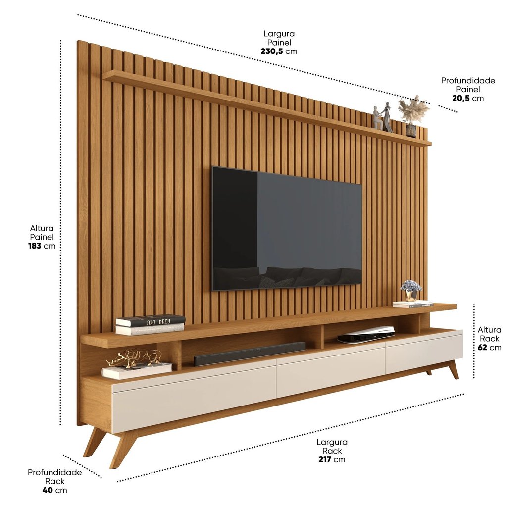Um conjunto perfeito para sua casa. Com prateleira para sua decoração e nichos para seus equipamentos eletrônicos, vai trazer para a seu ambiente um toque de aconchego e elegância. O painel em 100% ripado real deixando-o sofisticado. O rack com três gavetas espaçosas de design moderno, com corrediça telescópica que dá leveza a abrir. Pés em madeira maciça dando mais segurança ao rack. Este conjunto foi pensado para você que gosta de beleza e sofisticação para seu lar. Garantia: 03 Meses Altura (cm): 183 Acabamento: Impressão Largura (cm): 230.5 Possui Pés: Sim Peso do Rack: 56.098 Possui Vidro: Não Possui Portas: Não Altura do Rack: 62 Altura dos Pés: 12 Peso do Painel: 73.835 Possui Gavetas: Sim Possui Rodízio: Não Possui Tomadas: Não Suporta Até (kg): 35 Largura do Rack: 230.5 Possui Espelhos: Não Profundidade (cm): 42.5 Altura do Painel: 183 Escala de Brilho: Semi-Brilho Material dos Pés: Madeira Maciça Acabamento Ripado: Ripado Real Fixação na Parede: Sim Largura do Painel: 230.5 Possui Iluminação: Não Ambiente Principal: Sala de Estar Espessura do Tampo (mm): 4 Material da Gaveta: MDF/MDP Material Principal: MDF/MDP Possui Passa Cabos: Sim Espessura do Painel: 20.5 Sapatas Niveladoras: Não Acabamento da Gaveta: Impressão Profundidade do Rack: 40 Material da Prateleira: MDF/MDP Peso Máximo por Gaveta: 5 Acabamento da Prateleira: Impressão Tipo de Puxador da Gaveta: Embutido Peso Máximo por Prateleira: 5 Tipo de Corrediça da Gaveta: Metálica Telescópica Ideal para TVs até (Polegadas): 86 Escala de Brilho da Prateleira: Semi-Brilho Suporte de TV Universal Incluso: Não Marca: Giga Móveis Cor: Nature/Off White Cor do Produto: Nature/Off White Itens Inclusos: 1 Rack, 1 Painel e Ferragens Cor Predominante: Marrom Linha ou Coleção: Vivare