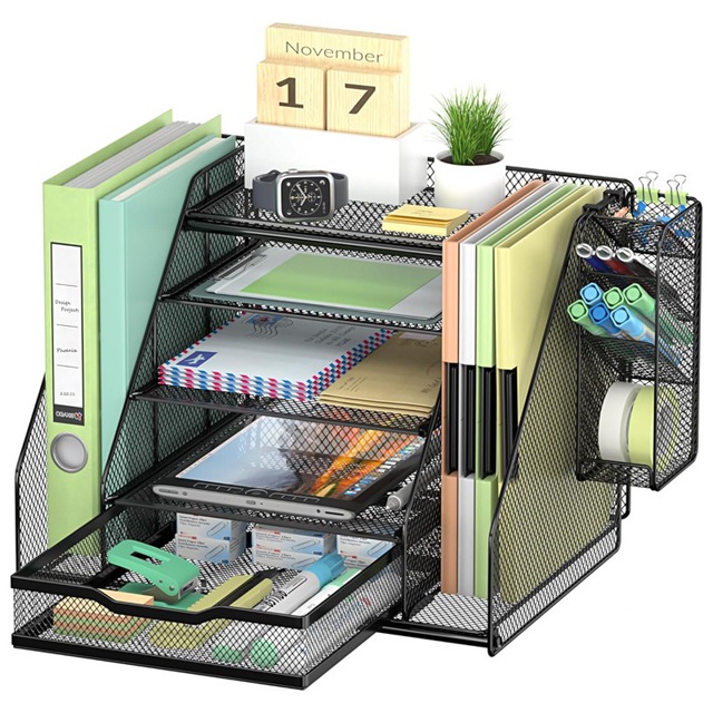 【Conjunto Organizador de Mesa Multifuncional】: O organizador de escritório humanizado possui 4 bandejas deslizantes + 2 porta-revistas + 1 porta-lápis suspenso + 1 gaveta deslizante; Possui espaço suficiente para diversos acessórios de mesa e melhora significativamente a sua eficiência no trabalho. 【Economia de Espaço】: O organizador de bandejas de papel é ideal para armazenar livros, revistas, cartas e papéis; o organizador de gavetas e o porta-canetas suspenso acomodam todos os acessórios de escritório; Ajuda você a evitar mesas desorganizadas e a se manter organizado. 【Material Premium】: Os materiais de escritório são feitos de malha leve e durável, reforçados com uma estrutura de aço sólido e adotam um acabamento em pintura a pó e tecnologia de galvanoplastia que os tornam resistentes, antioxidados e não desbotam. 【Design Exclusivo】: O design exclusivo do organizador de mesa multifuncional pode ser facilmente dobrado e guardado para economizar mais espaço quando não estiver em uso. 【Cenário de uso】: Este organizador é adequado para escritórios, salas de estudo, dormitórios, salas de estar, apartamentos e assim por diante. É perfeito para estudantes, professores, funcionários e familiares, pois é um bom auxiliar para organização e armazenamento. Também é uma ótima opção para presente!