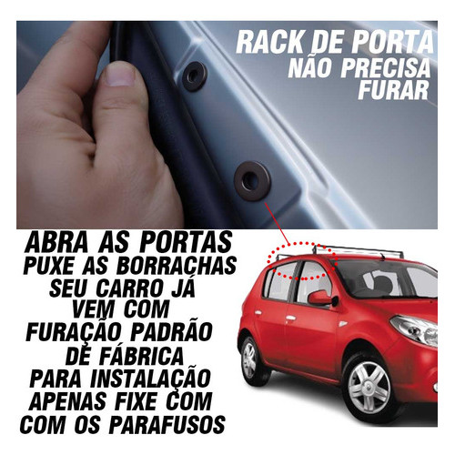 Rack de Teto Bagageiro Suporte Fixação Porta para Sandero 4 Portas - VHIP Compatibilidade: ANOS: 2007, 2008, 2009, 2010, 2011, 2012 Quer mais espaço para VIAJAR, TRABALHAR ou levar seus equipamentos com SEGURANÇA? O Rack Teto Bagageiro Porta - VHIP é a escolha PERFEITA para quem busca praticidade, resistência, SEGURANÇA e visual moderno. Com capacidade para até 50 kg de carga, ele permite transportar malas, bicicletas, pranchas, caixas de ferramentas ou materiais de trabalho com total segurança e estabilidade, sem ocupar o espaço interno do veículo. Além disso a VHIP oferece a QUALIDADE atestada pela CERTIFICAÇÃO de Processo ISO 9001, FIQUE ATENTO antes de compra! POR QUE O RACK VHIP SEM DÚVIDAS É O MELHOR VENDIDO NO BRASIL: - Com Sistema antifurto exclusivo, que dificulta a remoção indevida e protege seu investimento. - Certificação ISO 9001 – segue padrões internacionais de qualidade e rastreabilidade. - Design esportivo com acabamento perfeito – visual moderno e elegante. - Parafusos em aço liga 12.9 – material de alta resistência e durabilidade. - Estrutura reforçada – suporta até 50 kg com segurança. - Pintura em poliéster – resistente à ferrugem e à corrosão, prolonga a vida útil. - Encaixe perfeito – instalação precisa, sem folgas (Seguir orientações do Manual de Instalação) - Não risca o carro – protege a pintura original (Seguir orientações do Manual de Instalação). - Não fura o teto – fixação inteligente sem necessidade de perfurações. - Altura ideal – evita contato e acidentes com o teto do veículo. - Haste de ajuste de pressão fixa – não solta, não trepida, garante estabilidade. - Produto novo e com garantia – segurança total na compra. VANTAGENS: - Mais segurança contra furtos graças ao sistema antifurto patenteado que dificulta a remoção. - Proteção contra ferrugem e intempéries com pintura automotiva de qualidade premium. - Instalação simples e sem danos ao veículo. - Durabilidade MUITO SUPERIOR aos racks comuns, por usar materiais de padrão industrial e seguindo normas ISO9001 no processo de produção - Estabilidade e silêncio durante o uso, sem trepidações. Ficha técnica: Peso suportado: até 50 kg Material Suporte: Aço Certificado com acabamento em pintura Poliéster Material Tubo : Aço Certificado Galvanizado Fixação: Na porta Cor: Preto fosco Instalação: Sistema de aperto rápido com proteção anti risco. Itens inclusos: 1 - Par de racks completos (2 barras) 1 - Kit de fixação com parafusos, arruelas e porcas 1 - Manual ilustrado para instalação Compre direto da nossa LOJA OFICIAL VHIP ACESSÓRIOS, atendemos todo Brasil com RAPIDEZ, QUALIDADE E TODO SUPORTE QUE VOCÊ MERECE! DUVIDAS SOBRE INSTALAÇÃO ? TEMOS EXCLUSIVO CANAL - CENTRO de APOIO TÉCNICO AGORA CLIQUE EM COMPRAR ou se tiver ALGUMA DÚVIDA FAÇA SUA PERGUNTA E RESPONDEREMOS RAPIDAMENTE : )
