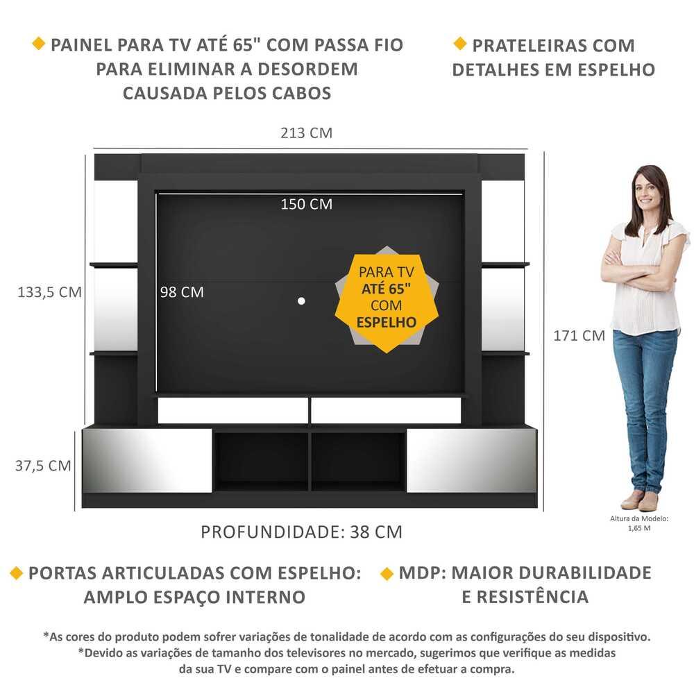 O Rack Estante com Painel TV 65" e Espelho Oslo Multimóveis é perfeito para você deixar seu ambiente organizado e muito bem decorado. Produzido em MDP, que garante maior durabilidade e facilidade na limpeza, além de um acabamento superior, possui 2 portas articuladas com um excelente espaço interno para organizar seus pertences, prateleiras para que você possa personalizar a decoração e nichos para acomodar todos os equipamentos. Os detalhes com espelhos nas portas e prateleiras deixam o móvel mais requintado, criando um ambiente moderno e charmoso. Os espelhos são de vidro (o que evita que a imagem fique distorcida) e lapidados, ou seja, passam por um processo para que as bordas não fiquem cortantes, o que garante maior segurança. O painel para TV de até 65” (suporta até 30kg) possui espaçamento para passagem dos fios, que permite deixar os cabos mais organizados. Uma sala de estar moderna, aconchegante e linda para receber os amigos e curtir os melhores filmes e séries. Conteúdo da Embalagem: 1 (uma) estante 1 (um) kit com 2 (dois) espelhos 1 (um) kit com 4 (quatro) espelhos Dimensões do produto montado: Altura: 171cm | Largura: 213cm | Profundidade: 38cm Painel - Altura: 98cm | Largura: 150cm *Devido as variações de tamanho dos televisores no mercado, sugerimos que verifique as medidas da sua TV e compare com o painel antes de efetuar a compra. *Você pode consultar as medidas internas na imagem técnica do produto. *As cores do produto podem sofrer variações de tonalidade de acordo com as configurações do seu dispositivo. Imagem meramente ilustrativa. Decoração e eletros não acompanham o produto. O produto será entregue desmontado e a Multimóveis não disponibiliza o serviço de montagem.