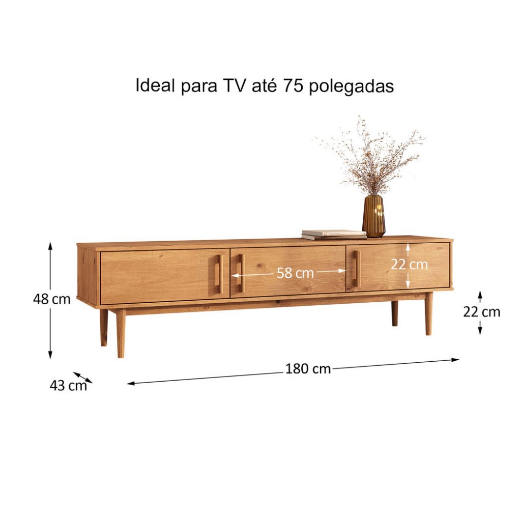 Design autêntico em sua forma mais minimalista. O Rack Madeira Maciça Minimalista Tecca traduz o essencial com personalidade. Feito inteiramente em madeira maciça com acabamento natural Freijó, ele realça os veios e as nuances únicas da madeira, reforçando a beleza do que é simples, bem-feito e duradouro. Seu visual limpo e funcional abriga três portas com puxadores verticais também em madeira, criando um ritmo visual orgânico e discreto. Os pés cônicos retos, marca registrada da peça, elevam o móvel com proporção equilibrada e presença firme. Com 180 cm de largura, oferece amplo espaço para organizar eletrônicos, objetos e decoração com naturalidade e fluidez. Ideal para quem busca um móvel de verdade, o Rack Tecca se adapta com facilidade à sala de estar, ambientes integrados ou espaços criativos, sempre valorizando a madeira e o design brasileiro com alma. Dimensões do Produto Largura: 180 cm Altura: 48 cm Profundidade: 43 cm Peso: 22 Kg Materiais e Acabamento Material da Estrutura: Madeira Maciça - Finger Tipo da Madeira: Pinus Escala de Brilho: Fosco Material dos Pés: Pinus Maciço Recomendação de Limpeza: Utilizar pano levemente úmido Características do Produto Quantidade de Portas: 3 Quantidade de Gavetas: 0 Quantidade de Nichos: 0 Quantidade de Basculantes: 0 Possui Rodízio: Não Estilo: Minimalista Ambiente Principal: Sala Precisa de Montagem: Sim Sistema de Montagem: Minifix / Cavilhas / Parafusos Complexidade da Montagem: Médio Volumes: 02 Garantia do Fabricante: 12 meses Manual de Montagem: Sim Diferenciais Produto Versátil Design Moderno/Rústico Madeira Maciça Mais Resistente que MDF Móvel Sustentável Madeira Certificada Pintura Livre de Solventes Produto Qualidade Europeia Informações Importantes Montagem e Desmontagem não inclusa ao produto, de responsabilidade do cliente. Não nos responsabilizamos, no ato da entrega, por subir escadas/elevadores ou transporte por guincho em apartamentos. Eventuais despesas são de responsabilidade do comprador. Ao receber a mercadoria, o cliente deverá verificar as condições da embalagem. Caso haja alguma avaria, não assine o comprovante de recebimento. Objetos que ambientam as fotos não acompanham o produto. Imagens meramente ilustrativas. Cores e tonalidades podem variar. O conjunto não pode ficar exposto ao sol ou chuva.