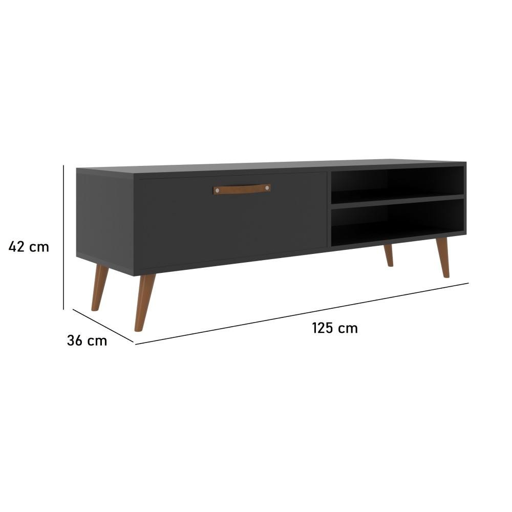 Suportando uma TV até de 55 polegadas, puxador em courvin sintético com seus pés palito em poliéster, estilo retrô, combinando com o puxador, prateleira que suporta até 7 kg, móvel perfeito para deixar seu ambiente mais aconchegante com seu estilo clássico e inovador. Produzido em MDP 15mm. Especificações - Comprimento: 125 cm - Largura: 36 cm - Altura: 42 cm - 1 Porta - 1 Prateleira - Cor: Preto - As configurações do seu monitor ou dispositivo móvel podem afetar a tonalidade da cor do produto. Conferir na descrição. - Recomendação de Limpeza: Limpar com pano seco para retirar o pó. Não aplicar produtos abrasivos. - Produtos de Enfeite e Eletrônicos Não Estão Inclusos.