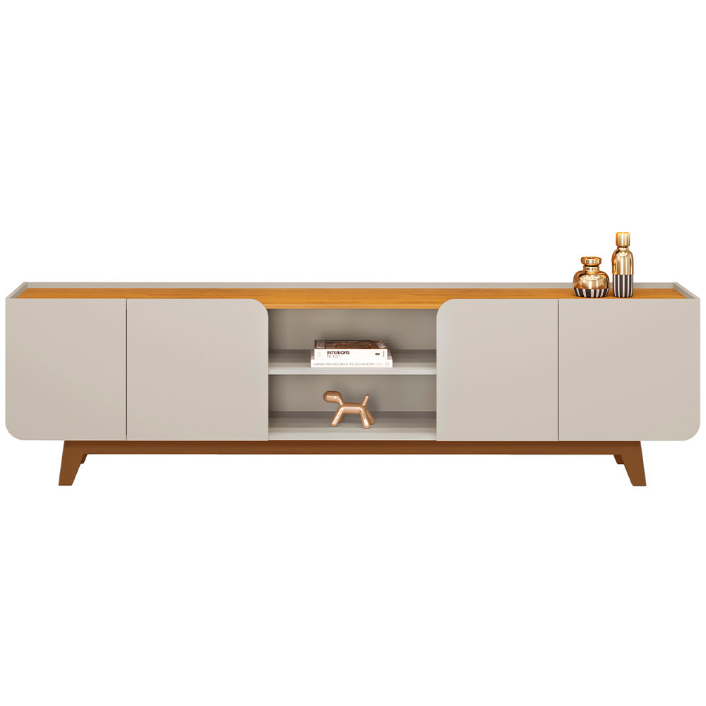 O Rack Para Sala de Estar TV 75 Pol Cine D05 BaliCedro, da Lyam Decor, combina funcionalidade e estilo em um só lugar. Com um tampo rebaixado que cria o efeito de bandeja e cantos curvos modernos, esse rack bancada traz o melhor do design contemporâneo para sua sala. Por sua vez, a funcionalidade fica por conta das quatro portas, já que garantem um amplo espaço interno para armazenar seus objetos. Além disso, os dois nichos e a prateleira entre as portas foram projetados intencionalmente para dispor os demais aparelhos eletrônicos ou até mesmo itens decorativos. Para completar, você ainda pode dispor de TVs de até 75 polegadas sobre o tampo e, assim, deixar o ambiente ainda mais imponente. Aproveite momentos de entretenimento com muito estilo com o Rack Cine. Garanta já o seu! Dimensões do produto (L x A x P) 220 x 60,5 x 40 cm. Características: Estrutura em MDP com acabamento em melamina e PU completo. Peças na cor Bali em impressão UV alto brilho; Peças na cor Cedro texturizada fosca. Encontro entre base e laterais com cantos curvos. Tampo rebaixado, estilo bandeja. Pés em madeira, estilo retrô. 4 portas de giro usinadas com cantos curvos. Suporta TV de até 75 polegadas. 02 Nichos centrais com passa fios e 04 compartimentos interno. - Produto entregue desmontado, acompanha manual de montagem. Sistema de montagem: Minifix, Cavilhas e Parafusos. - Este produto deve ser limpo com pano macio e seco. Não utilize produtos abrasivos como álcool e detergente, assim como esponjas rígidas ou palha de aço. - Proteja a superfície do móvel de objetos que transmitam calor ou umidade. Observações importantes: - Produto para uso residencial em ambiente interno, não devendo ficar exposto diretamente ao sol, calor e umidade excessivos. - Pode haver alguma diferença de tonalidade entre a imagem e o produto real, por conta do tratamento de imagens e a calibração de cores do seu monitor. - As imagens são meramente ilustrativas, não acompanham objetos de decoração e eletrônicos. - Ao receber a mercadoria, o cliente deve verificar as condições da embalagem, caso haja alguma avaria não assine o comprovante de recebimento. - Montagem, desmontagem e outras instalações serão de responsabilidade do cliente. Não nos responsabilizamos, no ato da entrega, por subir escadas/elevadores ou pelo transporte por guincho em apartamentos. Eventuais despesas são de responsabilidade do comprador. - Confira as dimensões do produto e certifique-se de que passará normalmente por supostos elevadores, portas, escadas e/ou corredores de sua residência.