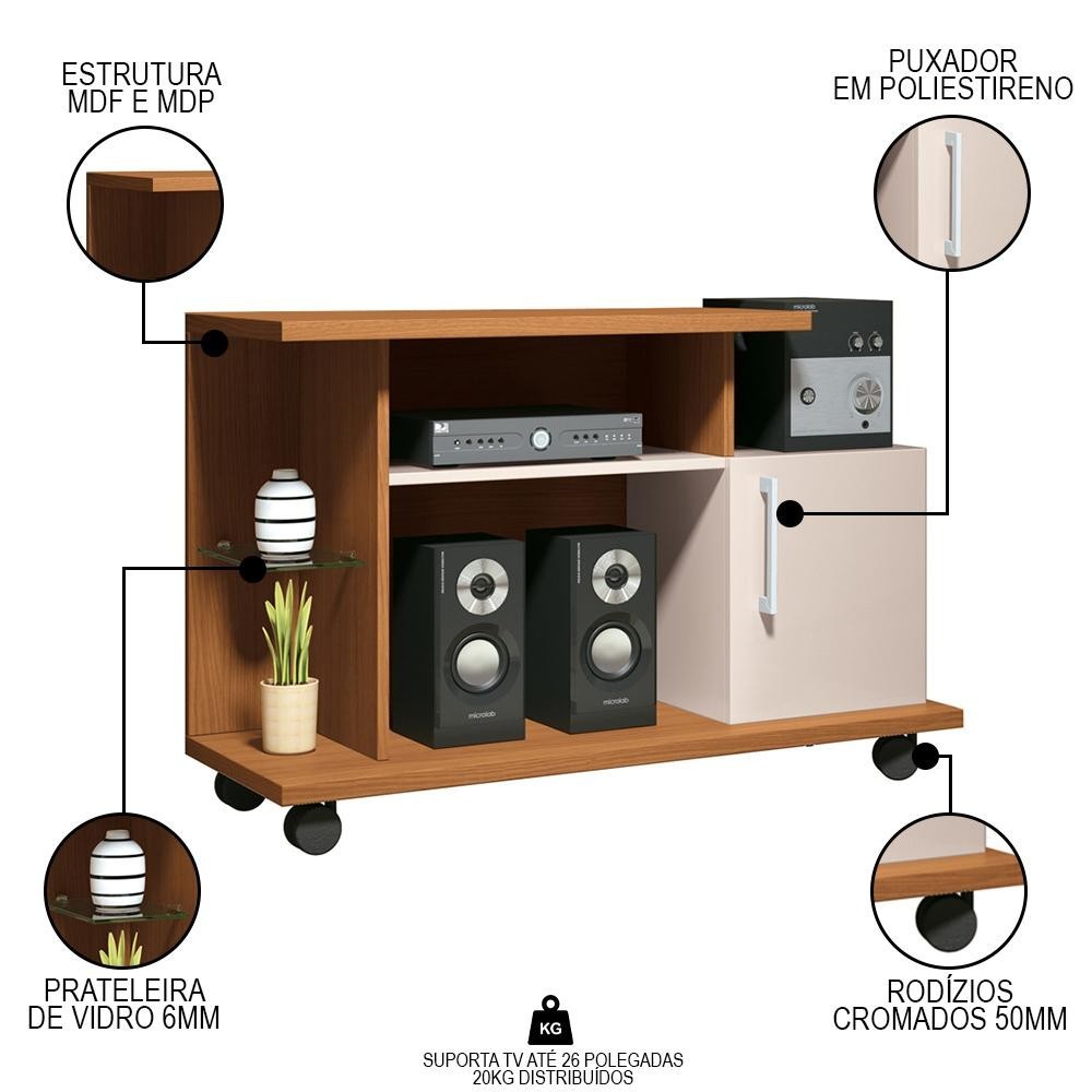 Para ter uma sala de estar moderna e funcional é necessário escolher corretamente os móveis que vão compor o ambiente. Primeiro, o ideal é ter em mente o tamanho do seu espaço; caso seja uma sala de estar pequena, então, a aposta deve ser em itens compactos, como o Rack para Sala Pequena TV até 26 Pol. 100cm Marte H01 Off White/Cinamomo, da Mpozenato. Vem ver! Mais que compacto, esse rack pequeno para sala ainda é muito versátil, pois os rodízios facilitam a mobilidade caso queira muda-lo de lugar, sem contar que na hora da limpeza também faz toda a diferença. Além disso, esse modelo suporta TVs de até 26 polegadas e você ainda pode aproveitar os demais nichos e prateleiras para dispor outros aparelhos eletrônicos e decoração. Dê uma cara nova para a sua sala, adicione hoje mesmo o rack para TV Marte ao seu carrinho e surpreenda com tamanha funcionalidade! Dimensões dos Produtos Largura: 100 cm. Altura: 64 cm. Profundidade: 38 cm. Peso: 19,56 kg. Características do Produto Material da estrutura: MDP/MDF. Acabamento: Impressão UV. Escala de Brilho: Fosco/Brilho. Peso Suportado: 20 kg distribuídos. Suporta TV de até: 26 Polegadas. Possui Portas: Sim. Quantidade de Portas: 1 Porta. Possui Gavetas: Não. Possui Prateleiras: Sim. Quantidade de Prateleiras: 2 Prateleiras. Possui LED: Não. Possui Pés: Sim. Tipo de Pés: Rodízios. Possui Passa Fios: Sim. Diferenciais: - Design moderno. - Tampo em MDP 25mm, maior resistência e durabilidade. - Puxador em poliestireno. - Prateleira em MDF 15mm e vidro 6mm. Sistema de Montagem: Girofix, Cavilhas, Cantoneiras e Parafusos. Manual de Montagem: Sim. Complexidade da Montagem: Média. Volumes: 1 Volume. Conteúdo da Embalagem: 1 Rack. Garantia do Fabricante: 90 dias contra defeito de fabricação. Montagem: Recomendamos que seja feita por um profissional. Recomendação de Limpeza: Utilize pano levemente úmido. Observações importantes - Produto para uso residencial em ambiente interno, não devendo ficar exposto diretamente ao sol, calor e umidades excessivas. - Pode haver alguma diferença de tonalidade entre a imagem e o produto real, por conta do tratamento de imagens e a calibração de cores do seu monitor. - As imagens são meramente ilustrativas, não acompanham objetos de decoração e eletrônicos. - Confira o estado da embalagem, não devendo assinar o comprovante em caso de danos. - Não asseguramos, no ato da entrega, por subir escadas/elevadores, pelo transporte por guincho em apartamentos ou montagem, desmontagem e instalações. Eventuais despesas são por conta do comprador. - Confira as dimensões do produto e certifique-se de que passará normalmente por supostos elevadores, portas, escadas e/ou corredores de sua residência.