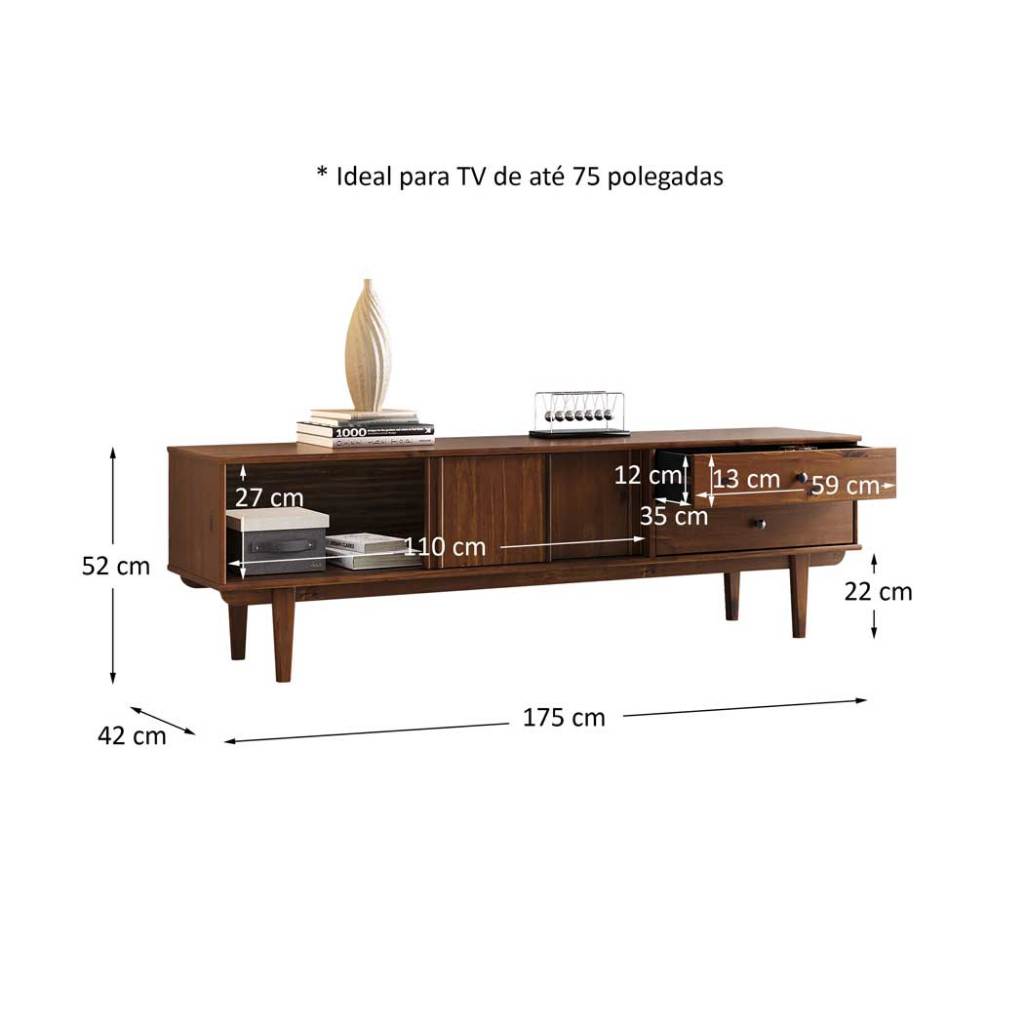 Feito de madeira. Feito para durar. O Rack Simona combina design contemporâneo e construção sólida para criar uma peça de destaque em qualquer ambiente. Seu acabamento refinado e o desenho das portas deslizantes traduzem elegância e leveza visual, equilibrando funcionalidade e estética com maestria. Com 175 cm de comprimento, é ideal para TVs de até 75, oferecendo amplo espaço para eletrônicos, livros e objetos decorativos. As portas deslizantes garantem praticidade no uso diário e mantêm o visual limpo, enquanto as gavetas internas com corrediças telescópicas proporcionam abertura suave e discreta. Os pés cônicos e o recuo inferior dão ao móvel uma aparência leve e sofisticada, valorizando o ambiente sem pesar na composição. O tampo robusto e a estrutura em madeira maciça asseguram durabilidade e estabilidade por muitos anos. O Rack Simona é a escolha perfeita para quem busca um móvel de presença, com design atemporal, materiais nobres e acabamento impecável, uma peça que vai muito além da função, elevando o estilo e o conforto da sala. Dimensões do Produto Largura: 175 cm Altura: 52 cm Profundidade: 42 cm Peso: 28 Kg Dimensões da Gaveta: 13 cm (A) x 59 cm (L) x 35 cm (P) Materiais e Acabamento Material da Estrutura: Madeira Maciça - Finger Tipo da Madeira: Pinus Escala de Brilho: Fosco Material dos Pés: Pinus Maciço Recomendação de Limpeza: Utilizar pano levemente úmido Características do Produto Quantidade de Portas: 2 deslizantes Quantidade de Gavetas: 2 Quantidade de Nichos: 1 Quantidade de Basculantes: 0 Possui Rodízio: Não Possui Passa-Fios: Sim Estilo: Minimalista / Escandinavo Ambiente Principal: Sala Ideal para TV de até: 75 polegadas Precisa de Montagem: Sim Sistema de Montagem: Minifix / Cavilhas / Parafusos Complexidade da Montagem: Médio Volumes: 01 Garantia do Fabricante: 12 meses Manual de Montagem: Sim Diferenciais Produto Versátil Design Moderno/Rústico Madeira Maciça Mais Resistente que MDF Móvel Sustentável Madeira Certificada Pintura Livre de Solventes Produto Qualidade Europeia Informações Importantes Montagem e Desmontagem não inclusa ao produto, de responsabilidade do cliente. Não nos responsabilizamos, no ato da entrega, por subir escadas/elevadores ou transporte por guincho em apartamentos. Eventuais despesas são de responsabilidade do comprador. Ao receber a mercadoria, o cliente deverá verificar as condições da embalagem. Caso haja alguma avaria, não assine o comprovante de recebimento. Objetos que ambientam as fotos não acompanham o produto. Imagens meramente ilustrativas. Cores e tonalidades podem variar. O conjunto não pode ficar exposto ao sol ou chuva