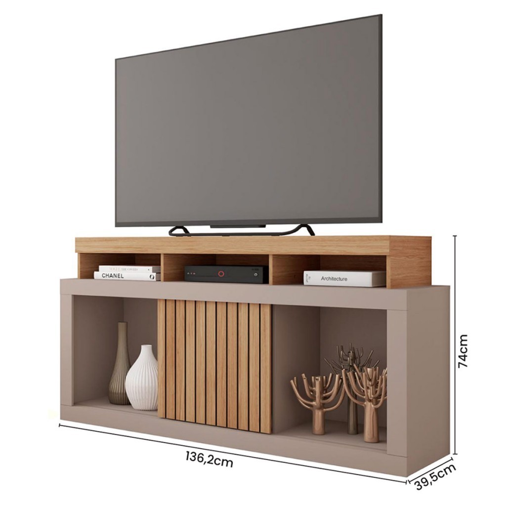 Dimensões: - Altura: 74,00 cm - Largura: 136,20 cm - Profundidade: 39,50 cm - Peso: 27,850 kg Descrição: O(a) Rack para TV Até 55 Polegadas Dragon 1 Porta Ripada Mel/Off White - Caemmun é produzido em MDF e MDP na escala de brilho Fosco, e possui um grau de dificuldade de montagem: Médio. Seu revestimento/acabamento é: Pintura UV. Infelizmente a Loja não oferece serviço de montagem, deixamos essa informação bem clara em todas as nossas páginas de produto. Onde especificamos que os móveis chegarão desmontados, e que a montagem fica por conta do cliente. Como não oferecemos esse serviço não embutimos o mesmo no preço dos produtos, ou seja, maior economia para você! Todos os nossos móveis também acompanham o manual de montagem, e caso você queira, pode realizar a montagem você mesmo, sempre especificamos os graus de montagem dos produtos. Nos casos de grau baixo e médio, com pouco ou nenhum conhecimento, você mesmo pode efetuar a montagem, e fazer essa economia. Apenas nos graus de montagem alto, recomendamos a contratação de um montador com experiência, visto que são montagens mais complicadas. A montagem é feita com Parafusos, cavilhas e Minifix.. Este móvel é indicado para que seja utilizado no(a) Sala de Estar, dando um toque especial no cômodo de sua casa. Para que você mantenha seu produto sempre em ótimo estado, recomendamos que use apenas um pano seco ou levemente umedecido, sem o uso de quaisquer produtos abrasivos. A Loja garante aos clientes, 90 dias de garantia nos produtos, porém, recomendamos que entre em contato com o fornecedor/marca do produto, pois o mesmo(a), pode garantir um prazo maior de garantia. Lembrando ainda que: quaisquer objetos decorativos que aparecem nas imagens, não acompanham o produto. Características: - Espessura da Estrutura: 15 mm - Possui Gavetas?: Não - Possui Portas?: Sim - Quantidade de Portas: 1 - Material da Porta: MDF - Espessura da Porta: 12 mm - Tipo de Porta: Portas de Correr - Material do Trilho: Plástico - Possui Vidro?: Não - Possui Espelho?: Não - Possui Prateleiras?: Sim - Quantidade de Prateleiras: 1 - Peso Suportado nas Prateleiras:: 5 Kg - Possui Puxadores?: Sim - Material do Puxador: MDF - Possui Ripamento?: Sim - Tipo de Ripado: Frisado - Linha ou Coleção: Dragon - Montagem Invertida?: Não Pode ser Montado Invertido - Cor interna: Bege e Cinza - É frágil?: Sim - Possui Nicho?: Não - Material da Estrutura: MDF e MDP - Escala de Brilho: Fosco - Material do Tampo: MDP - Espessura do Tampo (mm): 15 - Possui Rodízios?: Sim - Possui Sapatas?: Não - Possui Pés?: Não - Pés com regulagem de altura?: Não - Quantidade de Pés/Sapatas: 6 - Acompanha: 1 Rack e Manual de Montagem - Acompanha Manual de Montagem: Sim - Como os Móveis Chegarão na Minha Casa: Desmontado em caixas, acompanhado de todas as peças, ferragens e manuais para montagem. - Grau de Dificuldade da Montagem: Médio - Necessita de Montagem: Sim - Sistema de Montagem: Parafusos, cavilhas e Minifix. - Garantia (dias): 90 - Indicação de Uso: Sala de Estar - Observação: Objetos decorativos que aparecem nas imagens, não acompanham o produto. - Recomendação de Manutenção: Utilizar pano levemente umedecido, seguido de pano seco. Não utilizar quaisquer produtos abrasivos. - Revestimento /Acabamento: Pintura UV - Acompanha LED: Não - Acompanha Suporte para TV: Não - Ideal para TVs até: 55 - Medidas do Rack (A x L x P): 74 x 136 x 39,5 - Necessita de Fixação na Parede?: Não - Peso Suportado no Tampo (Kg): 25 - Possui Espaço Passa Fios: Sim - Possui Espelho?: Não - Possui Vidro?: Não - Tamanho: Médio - Tipo de Rack: Sem Painel