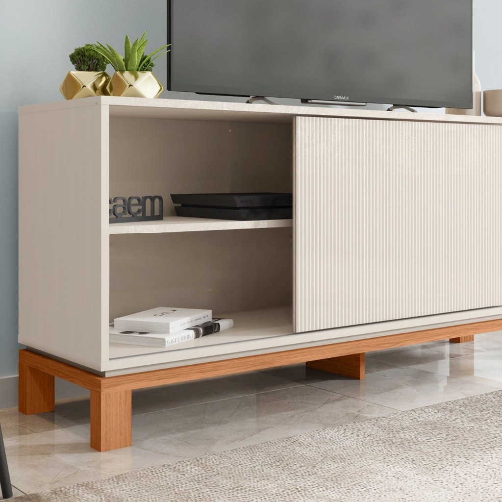 Rack para Tv até 55 Polegadas Porta com Textura Microrripada Pés Cavalete Mondrian 1.36 Off White/Freijó