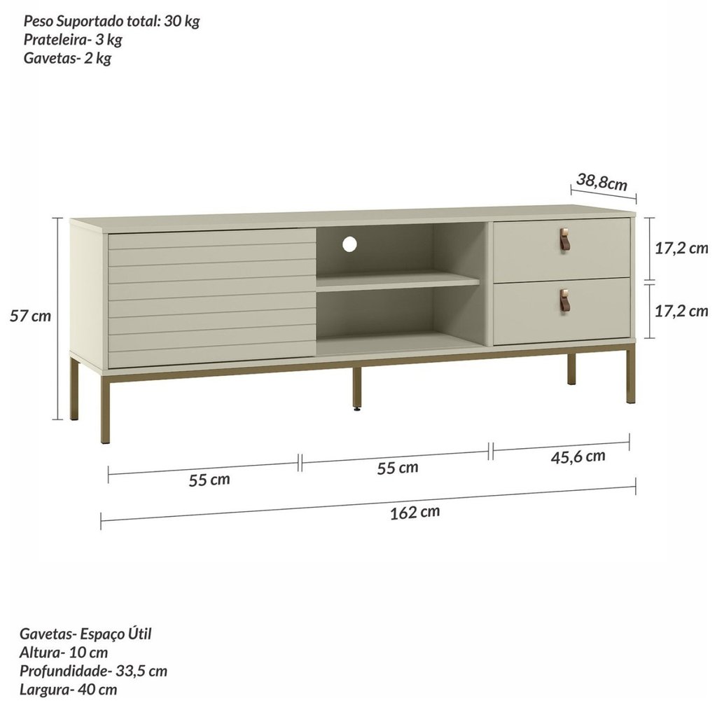 O Rack Industrial Dior é um produto com um design inovador e com diversidades de materiais. Possui puxadores com design caracterizados em couro natural, estruturas dos pés em metal na cor ouro envelhecido ou preto. Sua estrutura é em MDF e MDP de 15 mm, possui 1 prateleira para decoração ou eletrônicos, duas gavetas com corrediças telescópicas e uma porta deslizante em MDF frisada. É um produto com design de uma pegada industrial para quem gosta do estilo mais urbano e contemporâneo onde você personaliza seu ambiente deixando-o exclusivo. Estilo: Industrial Peso (kg): 30 Garantia: 03 Meses Altura (cm): 57 Acabamento: Acetinado Largura (cm): 162 Possui Pés: Sim Possui Adega: Não Possui Vidro: Não Possui Nichos: Não Possui Portas: Sim Tipo de Porta: Correr Possui Gavetas: Sim Possui Rodízio: Não Suporta Até (kg): 30 Profundidade (cm): 38.8 Escala de Brilho: Semi-Brilho Material dos Pés: Metal Material da Porta: MDF Origem do Produto: Nacional Possui Iluminação: Não Ambiente Principal: Sala de Estar Material da Gaveta: MDF/MDP Material Principal: MDF/MDP Possui Prateleiras: Sim Acabamento da Porta: Acetinado Sapatas Niveladoras: Sim Acabamento da Gaveta: Acetinado Material da Prateleira: MDP Peso Máximo por Gaveta: 2 Quantidade de Espelhos: Não Acabamento da Prateleira: Acetinado Tipo de Puxador da Porta: Embutido Escala de Brilho da Porta: Semi-Brilho Tipo de Puxador da Gaveta: Externo Escala de Brilho da Gaveta: Semi-Brilho Peso Máximo por Prateleira: 3 Tipo de Corrediça da Gaveta: Metálica Telescópica Ideal para TVs até (Polegadas): 65 Material do Puxador da Gaveta: Couro Escala de Brilho da Prateleira: Semi-Brilho Marca: Olivar Cor Flex: NÃO Cor Interna: Off White Cor: Off White Cor do Produto: Off White Itens Inclusos: 1 Rack, Manual de Montagem, Kit de Montagem Cor Predominante: Bege Cor da Porta: Off White Estilo do Pé: Industrial Modelo de Porta: Porta Ripada Quantidade de Prateleiras: 01 Prateleira Quantidade de Gavetas: 02 Gavetas