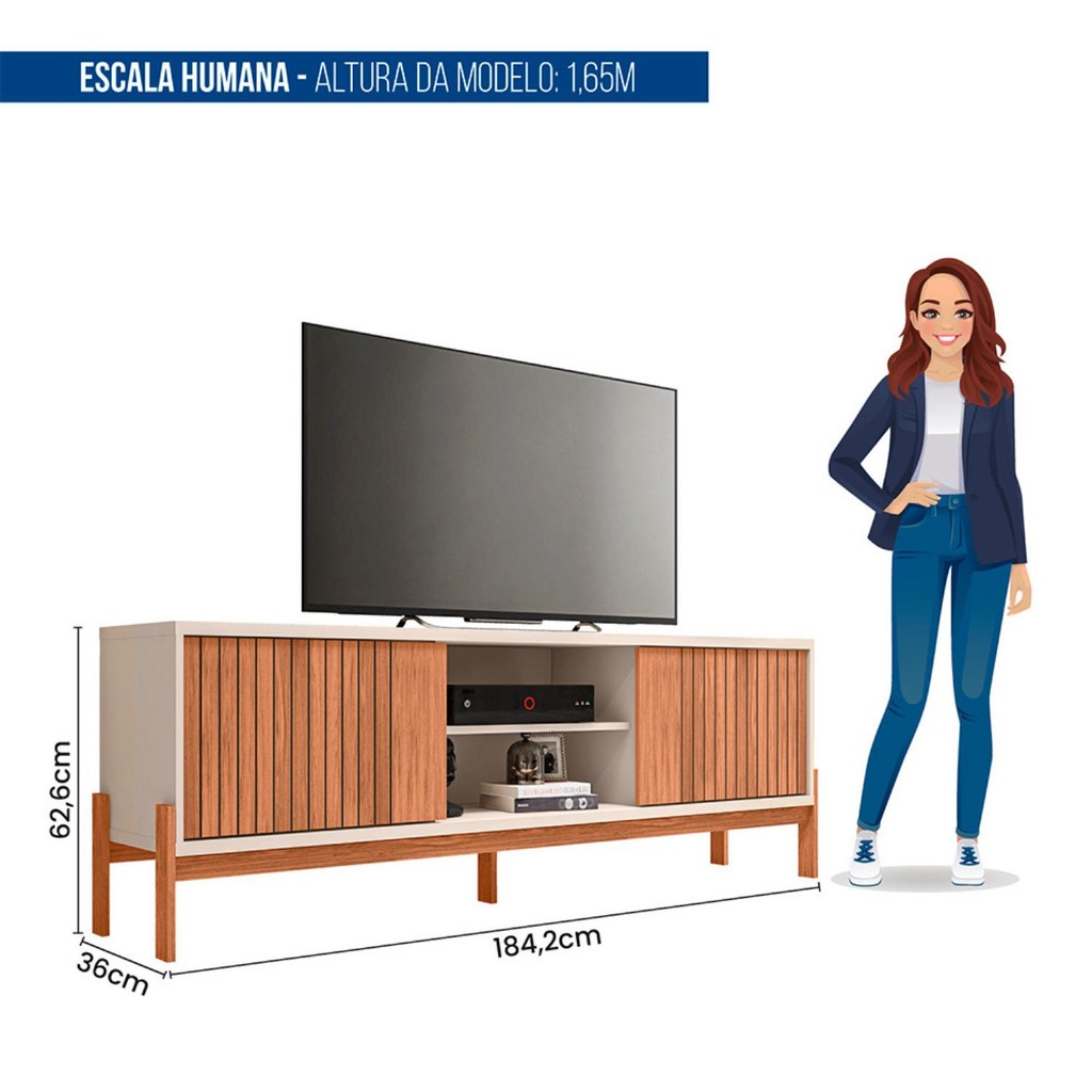 A Bancada Para TV Tannen é a opção perfeita para quem procura um móvel elegante e durável para a sala de estar. Os pés de cavalete em 18 mm dá um toque de estilo ao móvel, enquanto o acabamento em madeira é atemporal e sofisticado. Com 1.8 m de largura e capacidade para TVs de até 72 polegadas, o que a torna ideal para a maioria das salas. A porta de correr com detalhe ripado acrescenta modernidade ao design, se tornando perfeita para você. Características: Acabamento: Fosco Material da Estrutura: MDP 18 mm MDF 15 mm HDF 3 mm Possui Espelho/Vidro: Não Espessura do Espelho/vidro: Não possui Número de Portas: 2 Porta Tipo de Porta: Correr Material da dobradiça/trilho da porta: Plastico Material do puxador: Embutido Número de Gavetas: Não possui Tipo da Corrediça da gaveta: Não possui Material do fundo Gaveta: Não possui Espessura do fundo Gaveta: Não possui Número de pés: 5 Pés Tipo de pé: Cavaletes MDP Necessita Montagem?: Sim Conteúdo da Embalagem: 1 Rack, Kit Ferragens e Manual de Montagem Dimensões: Altura: 62,6 cm Largura: 184,2 cm Profundidade: 36 cm Peso: 35,35 Kg Garantia: 3 Meses Instruções/Cuidados: Limpar com pano macio levemente umedecido e em seguida pano macio seco. Não utilizar produtos abrasivos (lixas, esponjas) e/ou produtos a base de solventes (thinner, aguarrás).