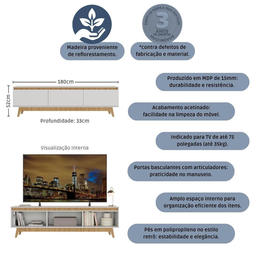Deixe sua sala ainda mais aconchegante com o Rack para TV até 75 Polegadas 180cm 3 Portas Retrô Multimóveis MP1102, o móvel perfeito para reunir a família, assistir aos seus filmes favoritos e viver momentos cheios de conforto e harmonia. Com um design moderno e pés no estilo retrô em polipropileno, ele traz um toque de charme e personalidade ao ambiente. Suas 3 portas basculantes com articulador e o amplo espaço interno permitem manter tudo organizado, deixando o visual da sala sempre leve e acolhedor. Produzido em madeira de reflorestamento (MDP 15mm), o rack é uma escolha que combina beleza, resistência e respeito à natureza. O acabamento acetinado com brilho suave valoriza cada detalhe e faz dele uma peça que se destaca pela elegância. Ideal para TVs de até 75 polegadas (até 35kg) — perfeito para quem busca unir praticidade e estilo em um só móvel. Diferenciais: - 3 anos de garantia contra defeitos de fabricação e material. - Pés retrô em polipropileno cheios de charme. - Amplo espaço interno: 3 portas basculantes com articulador. - Produzido em madeira de reflorestamento (MDP 15mm): durável e resistente. - Acabamento acetinado (cerca de 20% de brilho): facilidade na limpeza do móvel. - Indicado para TVs de até 75" (suporta até 35kg). Conteúdo da Embalagem: 1 (um) Rack para TV Manual de Montagem Kit Ferragem Dimensões do Produto Montado: Altura: 52cm | Largura: 180cm | Profundidade: 33cm *Você pode consultar as medidas detalhadas na imagem técnica do produto. *Devido às variações de tamanho dos televisores no mercado, sugerimos que compare o tamanho da sua TV com o rack antes de efetuar a compra. Observações Importantes: *As cores do produto podem sofrer variações de tonalidade de acordo com as configurações do seu dispositivo. *Aqui na Loja Multimóveis, você pode concluir sua compra facilmente com toda segurança. A entrega é garantida você está em 1° lugar. *Imagem meramente ilustrativa (decoração e eletros não acompanham o produto). *O produto será entregue desmontado e não disponibilizamos o serviço de montagem.