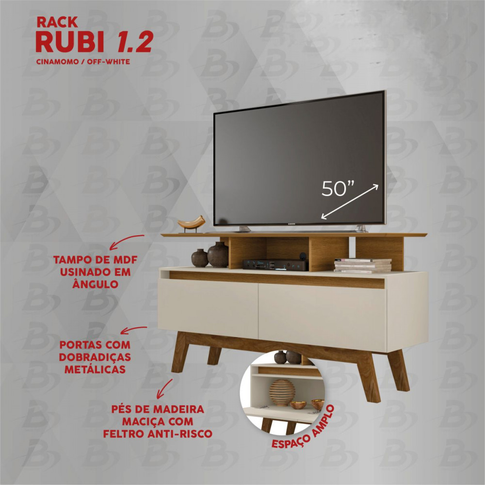 O Rack Rubi é a uma escolha inteligente para sua sala. Com designer retrô que irá encantar você. Ele possui tampo de MDF chanfrado em ângulo proporcionando ainda mais charme e requinte ao móvel. Seus pés são feitos de madeira maciça garantindo com isso ainda mais qualidade e resistência ao produto. Ideal para TVs de até 50 polegadas e nichos ideais para acomodar aparelhos eletrônicos, objetos de decoração, entre outros. Com tantas qualidades o Rack Rubi é perfeito para sua sala. Dimensões: Altura: 65 cm Largura: 120 cm Profundidade: 35 cm Características: Estrutura em MDF de 15 e MDP de 12 e 15mm Para TV até 50 polegadas (1,20x0,35) Tampo em MDF de 25mm com bordas usinadas em ângulo Acabamento Brilhante Dobradiça metálica 04 Pés em madeira Maciça Suporte de peso 39kg Garantia 03 meses AVISO: Esclarecemos que a OPÇÃO MÓVEIS se responsabilizará pela entrega dos produtos adquiridos até a porta de entrada ou portaria do endereço indicado, ou seja: é de total responsabilidade do cliente a montagem, desmontagem e instalação do produto adquirido. Para evitar futuros desagrados ou imprevistos com a entrega, também é necessário que o cliente confira as dimensões do produto escolhido, antes de finalizar a compra, devendo certificar-se de que a mercadoria passará normalmente por elevador, porta, escada e corredor.