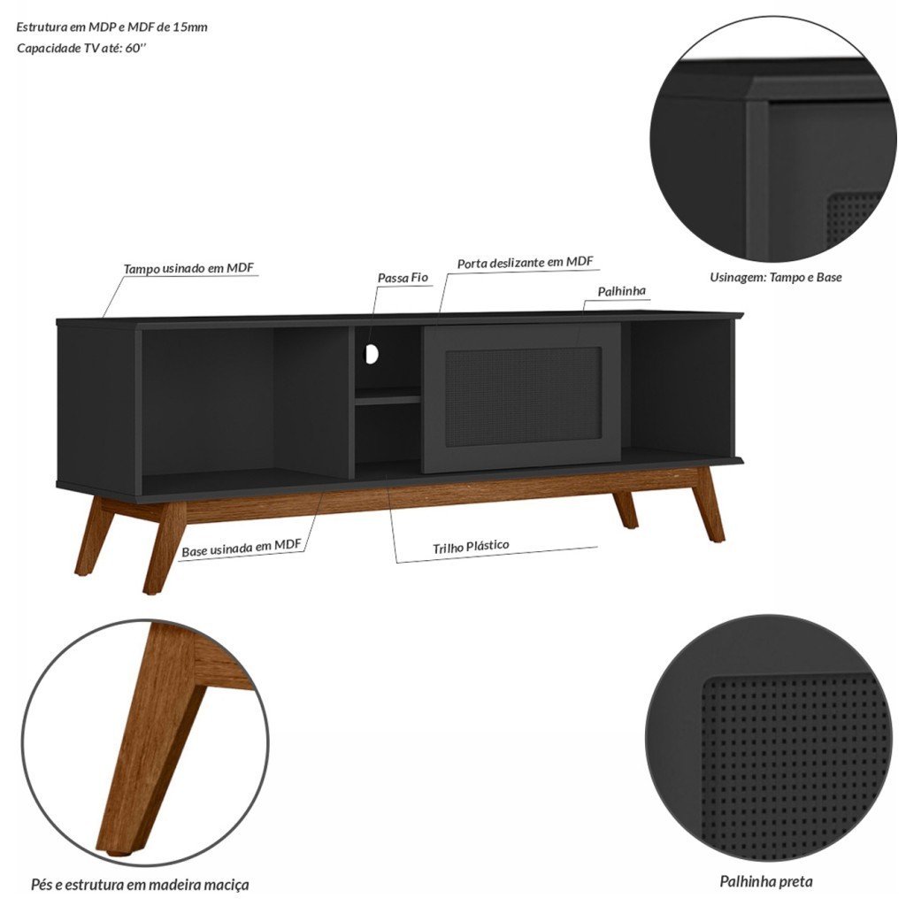 Descrição: O Rack Retrô Palha Panamá, possui um design único, deixando seu ambiente aconchegante e com personalidade. Feita em MDP e MDF de 15 mm, com tampo e a base em MDF com bordas chanfradas, uma porta deslizante também em MDF com telinha. Os pés são chassi em madeira envernizada. Possui três nichos para colocar objetos e eletrônicos e um espaço ótimo para sua TV com passa fio. Características: - Quantidade de Portas: 1 - Tamanho: Grande - Formato do Móvel: Rack - Peso do Produto Montado: 24Kg - Peso Máximo Suportado: 30Kg - Medida do Produto Montado (LXCXA): 38,8cmX162cmX54,6cm - Acabamento: Pintura UV - Escala de Brilho: Acetinado - Material da Estrutura: MDP 15 E MDF 15MM - Produto Necessita de Montagem?: Sim - Tipo de Gaveta: Não Possui - Quantidade de Pés: 4 - Tipo de Pés: De Madeira - Quantidade de Portas: 1 - Tipo de Porta: De Correr - Quantidade de Prateleiras: 2 - Tipo de Prateleira: Fixa - Quantidade de Nichos: 2 - Recomendações de manutenção: Pano úmido. Não aplicar lustra móveis. - Tamanho Máximo da Tv: 60 Polegadas - Volumes: 1 - Garantia: 3 Meses - Quantidade de Nichos: 1