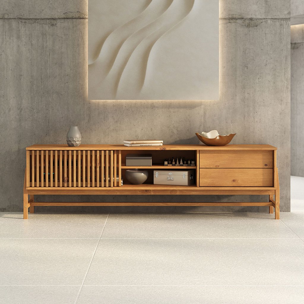 Feito de madeira. Feito para durar. O Rack Adamo combina o melhor do design contemporâneo com a autenticidade da madeira natural. Feito inteiramente em madeira maciça, ele revela veios e nuances únicas que tornam cada peça exclusiva — um verdadeiro destaque na decoração da sala. Seu desenho minimalista é marcado pelas portas ripadas deslizantes com sistema decorrer, que dispensam puxadores e reforçam a estética limpa e elegante. O tampo amplo comporta TVs de até 75”, enquanto os nichos internos oferecem espaço funcional para eletrônicos, livros e objetos decorativos, mantendo tudo bem organizado. As gavetas com corrediças telescópicas e sistema de fecho-toque proporcionam abertura suave e total, ideais para armazenar acessórios e controles. A estrutura elevada, sustentada por pés e travessas laterais, garante leveza visual e robustez à peça, além de facilitar a limpeza do ambiente. Com proporções generosas e acabamento natural, o Rack Adamo é a escolha perfeita para quem busca um móvel durável, sofisticado e atemporal — feito para valorizar o melhor do seu espaço. Dimensões do Produto: Largura: 185 cm | Altura: 52 cm | Profundidade: 40,5 cm | Peso: 27,5 Kg Dimensões da Gaveta: 13 cm (A) x 53 cm (L) x 30 cm (P) Materiais e Acabamento: Material da Estrutura: Madeira Maciça - Finger | Tipo da Madeira: Pinus | Escala de Brilho: Fosco | Material dos Pés: Pinus Maciço | Recomendação de Limpeza: Utilizar pano levemente úmido Características do Produto: Quantidade de Portas: 2 deslizantes | Quantidade de Gavetas: 2 | Quantidade de Basculantes: 0 | Possui Rodízio: Não | Estilo: Minimalista | Ambiente Principal: Sala | Ideal para TV de até: 75 polegadas | Precisa de Montagem: Sim | Sistema de Montagem: Minifix / Cavilhas / Parafusos | Complexidade da Montagem: Médio | Volumes: 02 | Garantia do Fabricante: 12 meses | Manual de Montagem: Sim Diferenciais: Produto Versátil | Design Moderno/Rústico | Madeira Maciça | Mais Resistente que MDF | Móvel Sustentável | Madeira Certificada | Pintura Livre de Solventes | Produto Qualidade Europeia Informações Importantes: Montagem e Desmontagem não inclusa ao produto, de responsabilidade do cliente. Não nos responsabilizamos, no ato da entrega, por subir escadas/elevadores ou transporte por guincho em apartamentos. Eventuais despesas são de responsabilidade do comprador. Ao receber a mercadoria, o cliente deverá verificar as condições da embalagem. Caso haja alguma avaria, não assine o comprovante de recebimento. Objetos que ambientam as fotos não acompanham o produto. Imagens meramente ilustrativas. Cores e tonalidades podem variar. O conjunto não pode ficar exposto ao sol ou chuva.