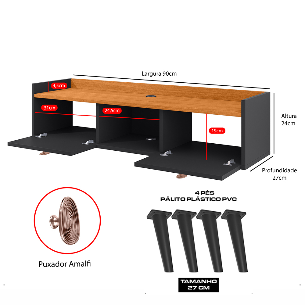 CARACTERÍSTICAS DO PRODUTO: - Medidas: 24cm (Altura) 90cm (Largura) 27cm (Profundidade) - Peso suportado: Até 10 kg distribuídos - Produzido em MDP 12mm - 2 Porta com dobradiças metálicas -4 Pés em Plastico PVC Duravél - Puxador Amalfi Poliestireno Metalizado - Nicho decorativo - Tampo espaçoso com passa-fio Destaques do produto: • Design inteligente – Montagem prática e fixação na parede para um ambiente mais organizado e espaçoso. • Organização garantida – Com duas portas basculantes, perfeitas para armazenar objetos diversos. • Versatilidade – Combina perfeitamente com diversos estilos de decoração.