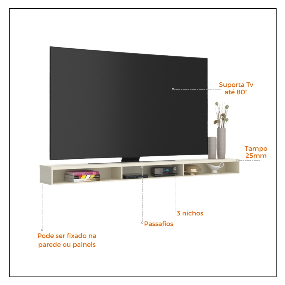 Rack Suspenso para TV até 70” – 160 cm – 2 Nichos Slim – MDPRack suspenso de maior dimensão, ideal para salas amplas e para TVs maiores. Modelo funcional, compacto na altura e profundidade, perfeito para organização e otimização de espaço. Especificações Técnicas: Modelo: Rack Suspenso Material: MDP Quantidade de nichos: 2 Indicação de TV: Até 70 polegadas Tipo de instalação: Suspenso (fixação na parede) Dimensões do Produto: Largura: 160 cm Altura: 15 cm Profundidade: 25 cm Dimensões Internas dos Nichos (cada):Largura: 78 cm Altura: 11 cm Profundidade: 25 cm Ideal para acomodar aparelhos como receptor, videogame, soundbar, modem e objetos decorativos, mantendo o ambiente organizado e moderno. Rack Suspenso para TV até 80” – 200 cm – 3 Nichos – MDP Rack suspenso de grande porte, ideal para ambientes amplos e para TVs de grandes dimensões. Modelo funcional e moderno, perfeito para quem busca organização sem ocupar espaço no piso. Especificações Técnicas: Modelo: Rack Suspenso Material: MDP Quantidade de nichos: 3 Indicação de TV: Até 80 polegadas Tipo de instalação: Suspenso (fixação na parede) Dimensões do Produto: Largura: 200 cm Altura: 15 cm Profundidade: 25 cm Dimensões Internas dos Nichos (cada):Largura: 64 cm Altura: 11 cm Profundidade: 25 cm Ideal para acomodar diversos aparelhos eletrônicos como receptor digital, videogame, modem, soundbar e itens decorativos, mantendo o ambiente organizado, moderno e com visual clean. Observações Importantes: - Produto não deve ficar exposto diretamente ao sol, calor e umidades excessivas. - Recomendações de Limpeza: Utilize somente pano seco ou levemente umedecido. - O produto pode sofrer alterações de tonalidade conforme o seu monitor. - Imagens meramente ilustrativas, produto não acompanha objetos de decoração e eletrônicos. - Ao receber, verifique a embalagem. - Não nos responsabilizamos, no ato da entrega, por subir escadas/elevadores. -A montagem do produto é de responsabilidade do cliente. Para garantir a qualidade e a sua segurança, recomendamos fortemente a contratação de um montador profissional. Não cobrimos danos causados por erros de montagem