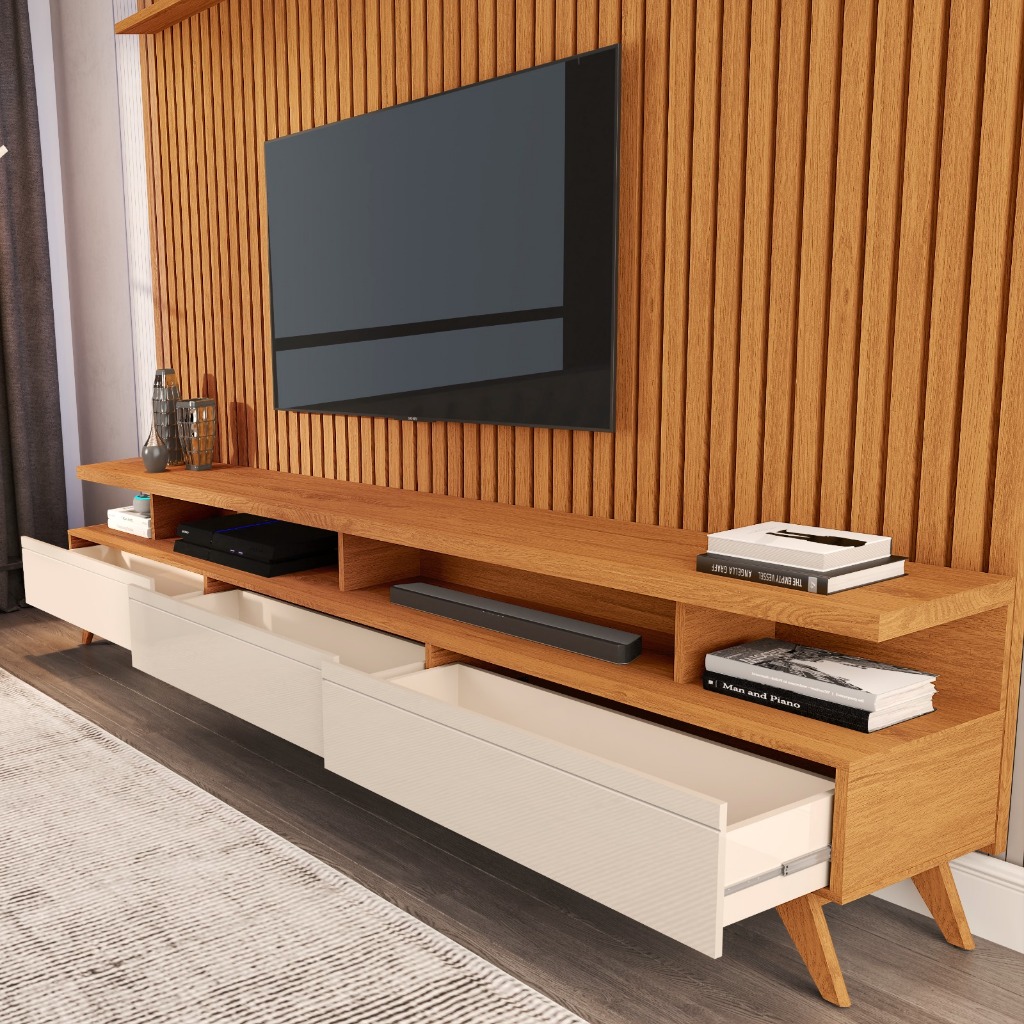 Um conjunto perfeito para sua casa. Com prateleira para sua decoração e nichos para seus equipamentos eletrônicos, vai trazer para a seu ambiente um toque de aconchego e elegância. O painel em 100% ripado real deixando-o sofisticado. O rack com três gavetas espaçosas de design moderno, com corrediça telescópica que dá leveza a abrir. Pés em madeira maciça dando mais segurança ao rack. Este conjunto foi pensado para você que gosta de beleza e sofisticação para seu lar. Medidas do Produto Montado: Altura: 220 cm Largura: 230 cm Profundidade: 40 cm Junto com o produto, há um manual de instruções muito fácil de entender para ajudá-lo na montagem. Se você tiver alguma dúvida ou não se sentir seguro em realizar a montagem sozinho, recomendo procurar a ajuda de um profissional. Dessa forma, você terá certeza de que o seu produto será montado corretamente e poderá aproveitá-lo ao máximo.