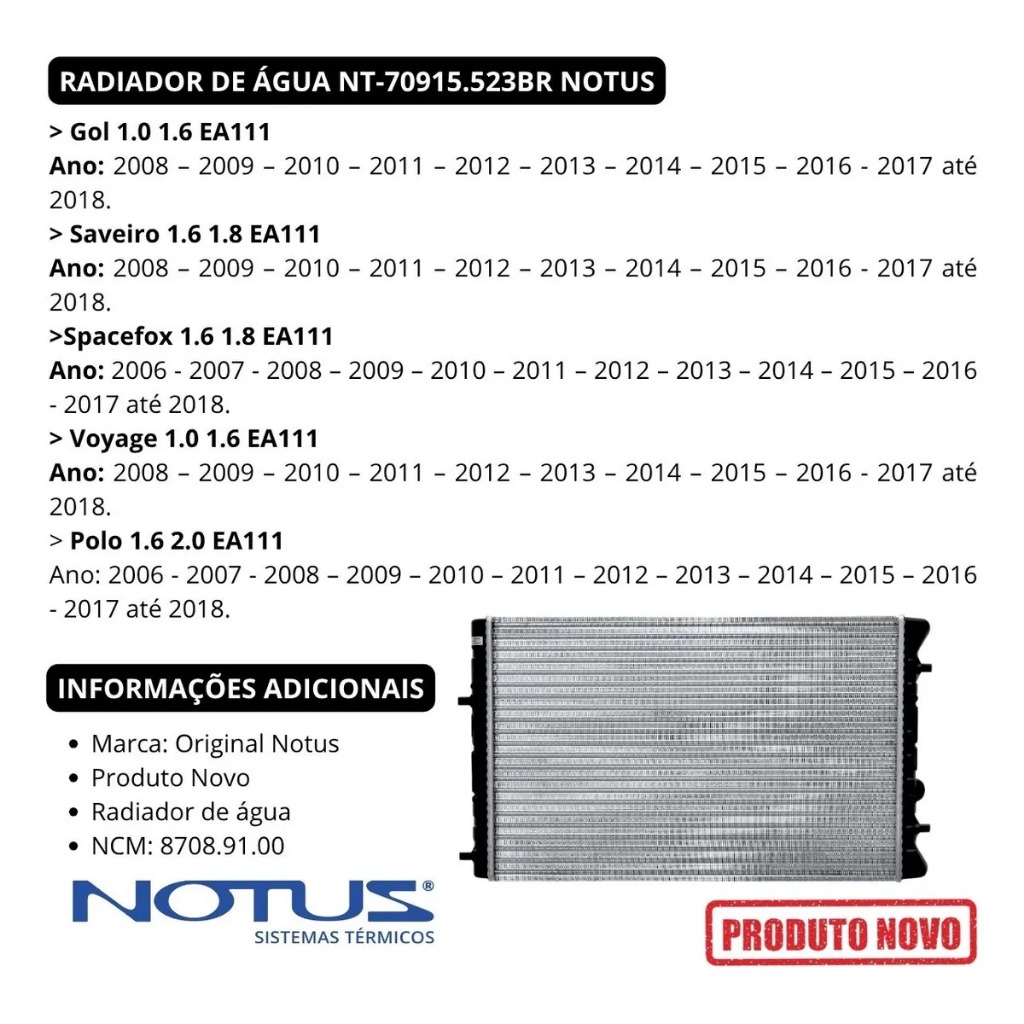 >>> PRODUTO ORIGINAL NITUS VOCÊ ENCONTRA AQUI <<< PRODUTO: Radiador Gol G5 2009 2010 2011 2012 C/ Ar Novo COMPATÍVEL COM VEÍCULOS MONTADORA: Volkswagen • Gol 1.0 1.6 EA111 Ano de aplicação: 2008 – 2009 – 2010 – 2011 – 2012 – 2013 – 2014 – 2015 – 2016 - 2017 até 2018. • Saveiro 1.6 1.8 EA111 Ano de aplicação: 2009 – 2010 – 2011 – 2012 – 2013 – 2014 – 2015 – 2016 - 2017 até 2018. • Spacefox 1.6 1.8 EA111 Ano de aplicação: 2006 – 2007 - 2008 – 2009 – 2010 – 2011 – 2012 – 2013 – 2014 – 2015 – 2016 - 2017 até 2018. • Voyage 1.0 1.6 EA111 Ano de aplicação: 2008 – 2009 – 2010 – 2011 – 2012 – 2013 – 2014 – 2015 – 2016 - 2017 até 2018. • Polo 1.6 2.0 EA111 Ano de aplicação: 2006 – 2007 - 2008 – 2009 – 2010 – 2011 – 2012 – 2013 – 2014 – 2015 – 2016 - 2017 até 2018. INFORMAÇÕES ADICIONAIS • Altura: 415mm • Largura: 632mm • Espessura: 23mm • Peso 2,6kg • Construção Alumínio Expandido • Original Notus • Veículos com Arcondicionado ITENS INCLUSOS 01 UN Radiador Gol G5 2009 2010 2011 2012 C/ Ar Novo COMPATÍVEL COM AS SEGUINTES REFERÊNCIAS BC261470-1220RC - BC422133-0050RC - 5Z0121253D - 735124R - 735146R - CR 2145 000S - NT-20736.523 - NT-20736.523BR - RD 6528 E - 40-20736.523 - RMM698001M – 12528
