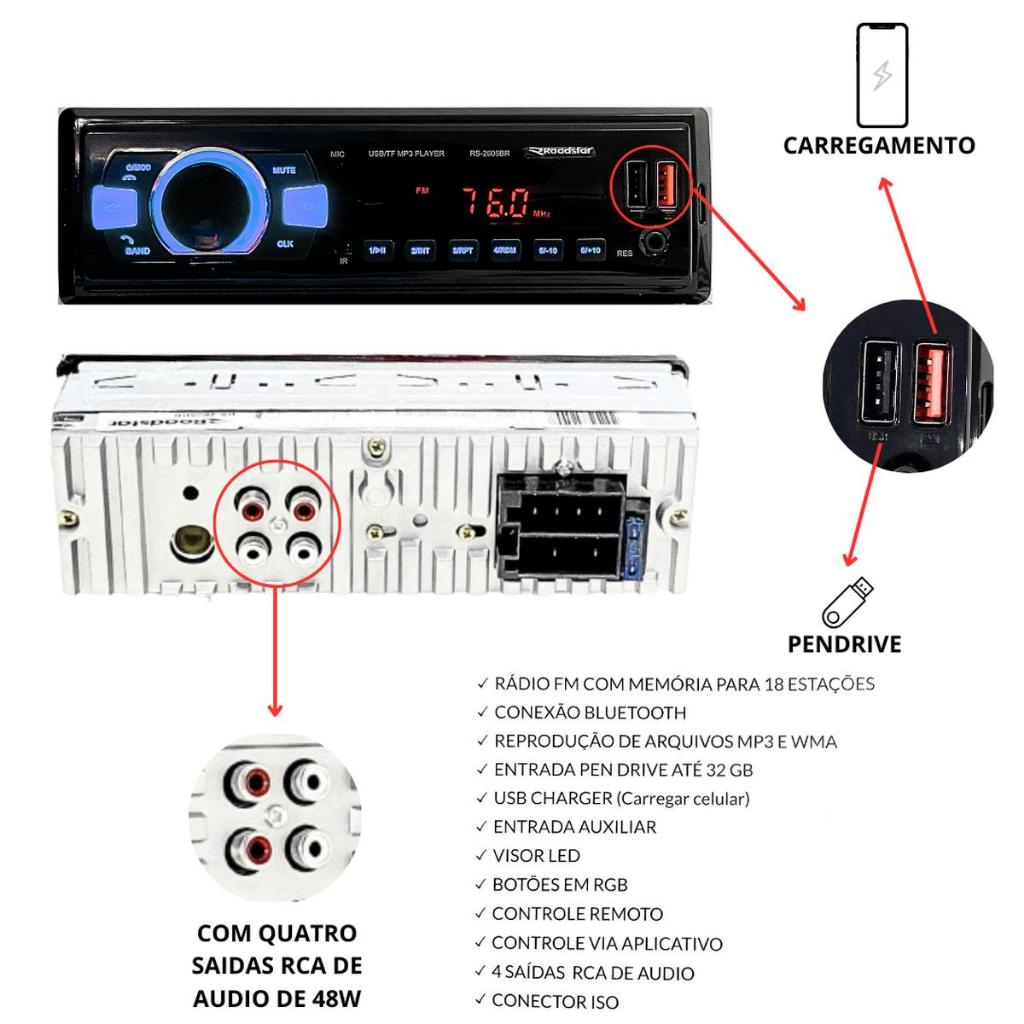 --------- BEM VINDOS A NOSSA LOJA --------- > Para você que procura por um rádio automotivo BEM COMPLETO e com um valor muito bom, acabou de encontrar o rádio certo!!! > É o mais completo da categoria, então se você esta procurando custo benefício está no lugar certo. > Além de poder configurar o seu controle longa distancia, voce pode baixar um APP no seu celular e usar o controle pelo aplicativo. ** APLICATIVO QUE PRECISA BAIXAR NO SEU CELULAR PARA PODER USAR CONTROLE PELO CELULAR : CARLIVE ** ## Motivos para comprar este rádio automotivo !!!! ## > Esse aparelho é HOMOLOGADO ANATEL. > O que é um produto homologado anatel? R: Significa que que os produtos são testados respeitando todos os padrões de qualidade, segurança e funcionalidades técnicas regulamentadas. Garantindo ao consumidor a aquisição de um produto de altíssima qualidade!!! > Esse é o rádio mais completo da categoria, ele tem BLUETOOTH, 4x 48w totalizando 192w de potência, com uma excelente qualidade sonora para você ouvir todas as suas playlist favoritas. > Possui 7 opções de cores no LED > Alem de aceitar controle longa distancia, voce pode baixar o aplicativo "CARLIVE" no seu celular e usar controle pelo celular ------------------------------------------- Funções e Conectividade: ------------------------------------------- > Função Bluetooth para escolha e reprodução de músicas via dispositivo móvel > Compatível com aplicativo de celular para baixar controle longa distancia > Aceita controle longa distancia > Função Bluetooth para Chamadas Viva Voz e Audio Streaming > Microfone Embutido > Possui Busca por Pastas --------------------------------------------- Entradas e Saídas de Áudio: --------------------------------------------- > Saída para 4 Alto Falantes (Saída Via Fio) > Saída de Áudio: 4x48W 4 Ohms, 192w > 4 saídas RCA para ligar módulo (MELHOR CUSTO BENEFÍCIO) ---------------------------------------------------------- Entradas para Dispositivos Externos: ---------------------------------------------------------- > 2 Entrada USB - 1 Para Carregar o celular e outra para Pendrive > Entrada USB Frontal Até 32GB > Entrada auxiliar > Entrada SD ------------------------------------------------- Especificação Técnica da Tela: ------------------------------------------------- > MP3 Player 1 Din > Display com LED > Botões com Iluminação e 7 opções de LED --------------------------------------------------------- Formatos de Arquivos Compatíveis: --------------------------------------------------------- > Reprodução de Arquivos: MP3 e WMA ----------------------------------------------------- Especificação Técnica de Rádio ----------------------------------------------------- > Sintonizador FM: 76Mhz a 108MHz > Memória para Gravação de 18 Estações FM > Função Auto Memo: Memorização Automática das Estações de Rádio com Melhor Recepção de Sinal ------------------------------------------ Informações Adicionais: ------------------------------------------ > 4 Pré-Equalizações > Equalizador Flat, Pop, Rock e Classic > Equalizador de 2 Bandas > Função Loudness para Reforço das Frequências > Função Bass e Treble para Ajuste das Frequências > Função Relógio > Dimensões Aproximadas (LxAxP): 18,5x5,5x6cm > Conector iso 12 vias > Homologado pela ANATEL ------------------------------------------------ ÍTENS INCLUSOS: ------------------------------------------------ > 01 MP3 Player > 01 Controle remoto. > Chicotes > Manual do Usuário > Manual e Garantia ---------------------------------------------------------------- Recomendamos que a instalação seja feita por profissional especializado e não nos responsabilizamos pelo mau uso do produto. --------------------------------------------- Por que comprar com nós ? --------------------------------------------- > Trabalhando com uma equipe de profissionais ágeis e habilidosos procuramos levar aos nossos clientes não apenas uma experiência de compra e venda mas sim atender suas expectativas, lhe proporcionando uma experiência única e agradável. > Todos os nossos produtos além de preservar a autenticidade e originalidade dos fabricantes com os quais trabalhamos, são de alta qualidade e procedência. > Garantimos todo nosso estoque a pronta entrega, por isso temos e entrega mais rápida do Brasil !!! > Todos os produtos são 100% originais > Só recebemos o dinheiro da compra após sua confirmação de que o produto chegou como a descrição e em perfeito estado de funcionamento. > Após a compra terá uma equipe disponível 24hr para te dar todo suporte e esclarecer qualquer duvida. > Estamos aguardando sua compra!!!!
